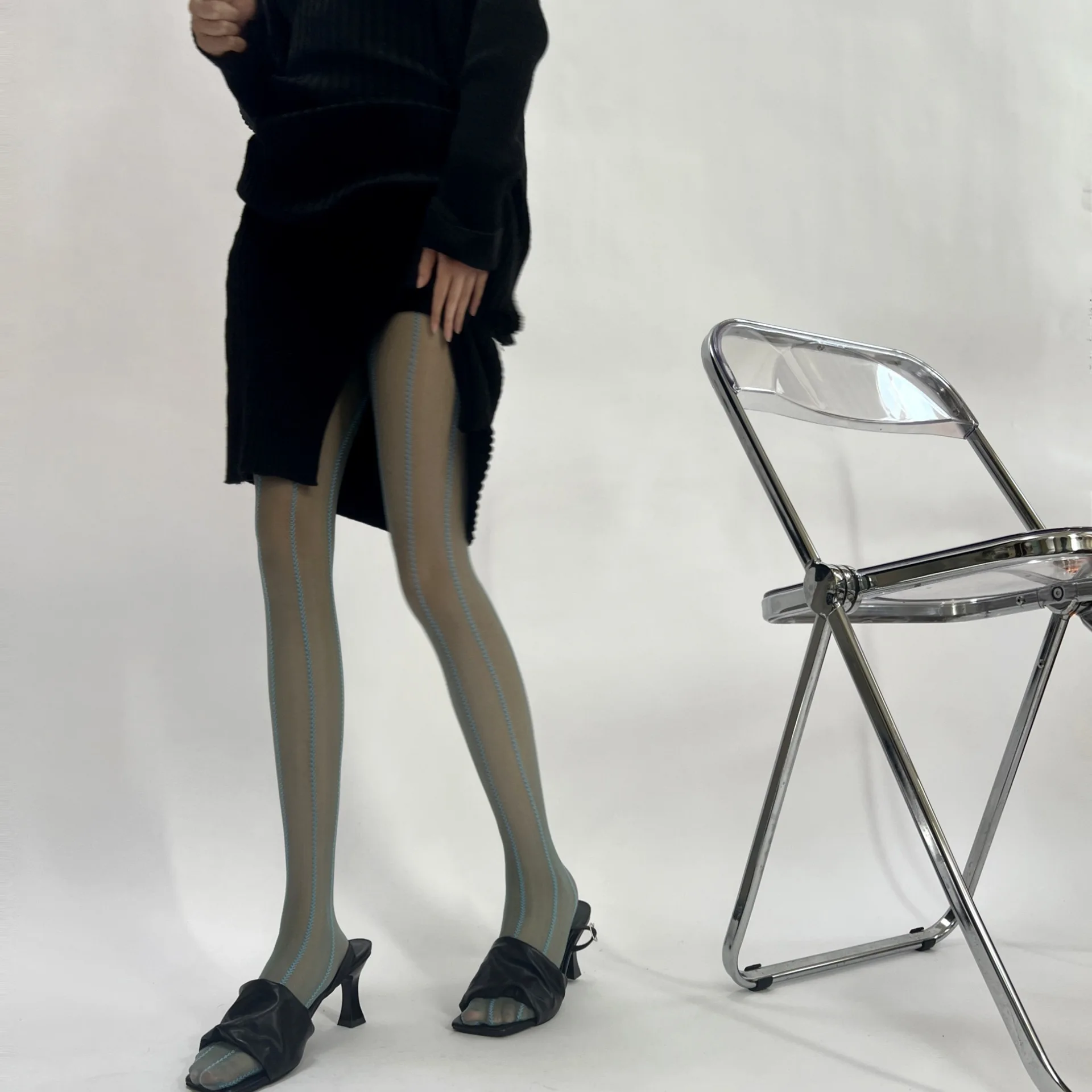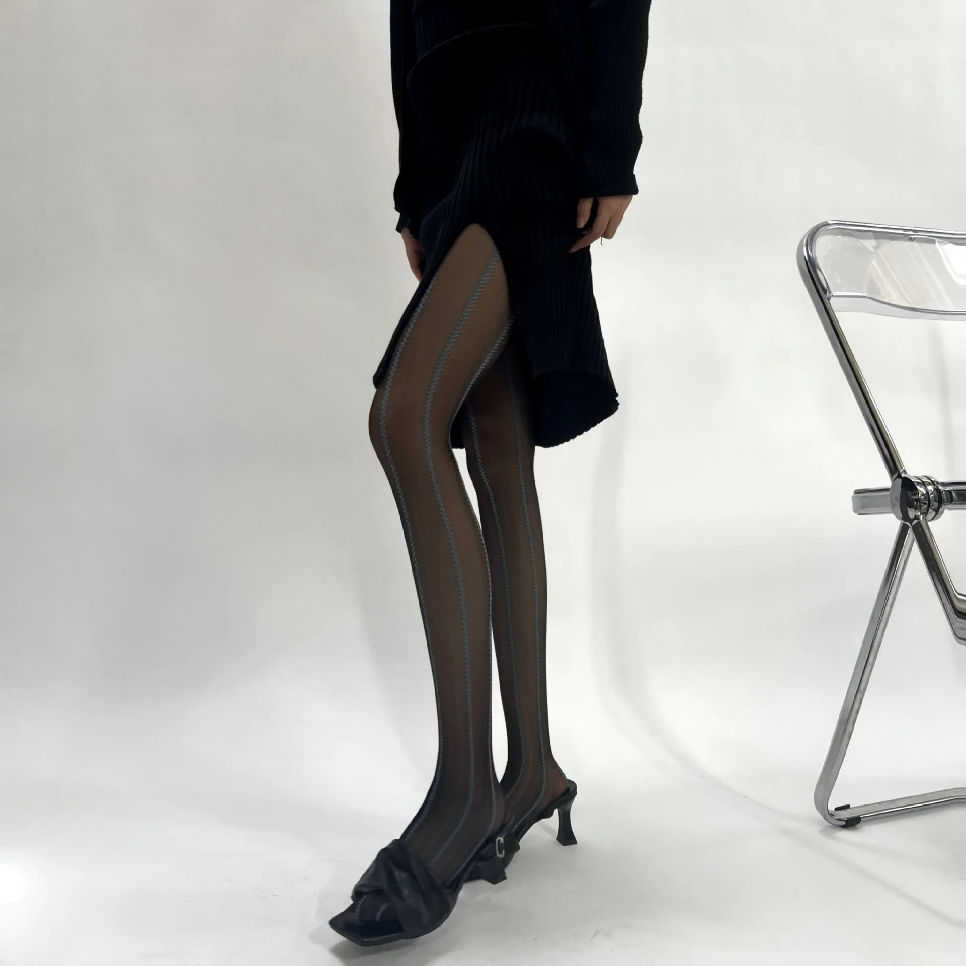 Retro Japanese Vertical Shrimp Line Blue Green Lean Grain Leggings Slim White Jacquard Leggings Lolita Stockings