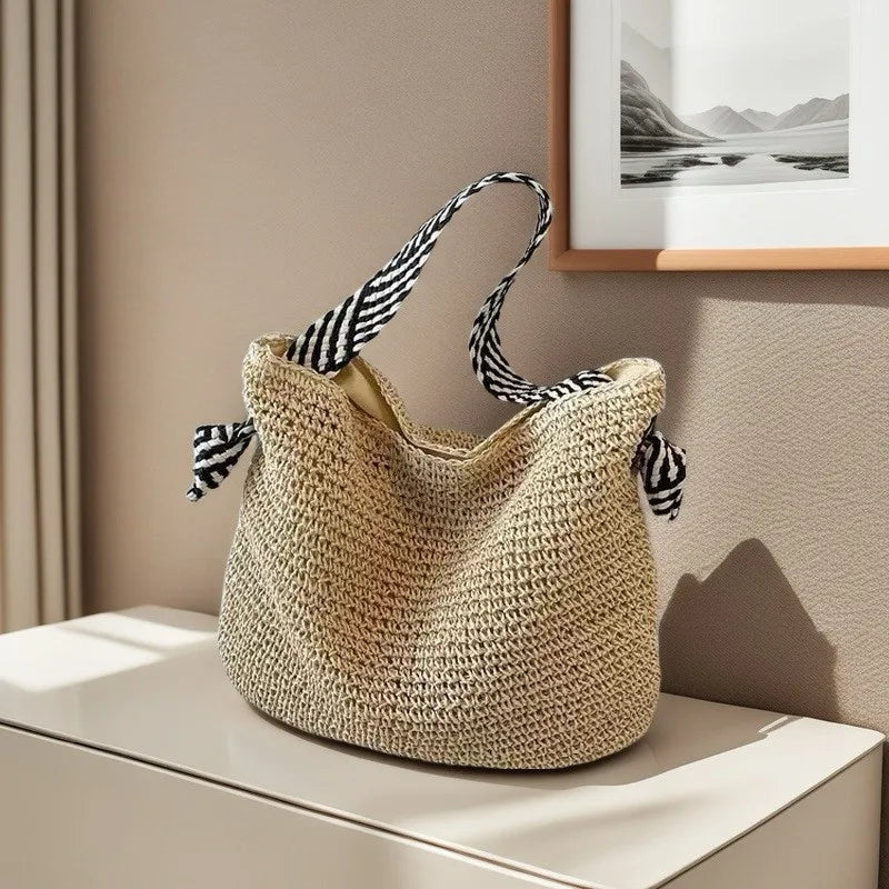Pbong Straw Woven Beach Bag for Women Fashion Large Capacity Travel Vacation Women's Shoulder Bag Summer New Casual Female Handbags