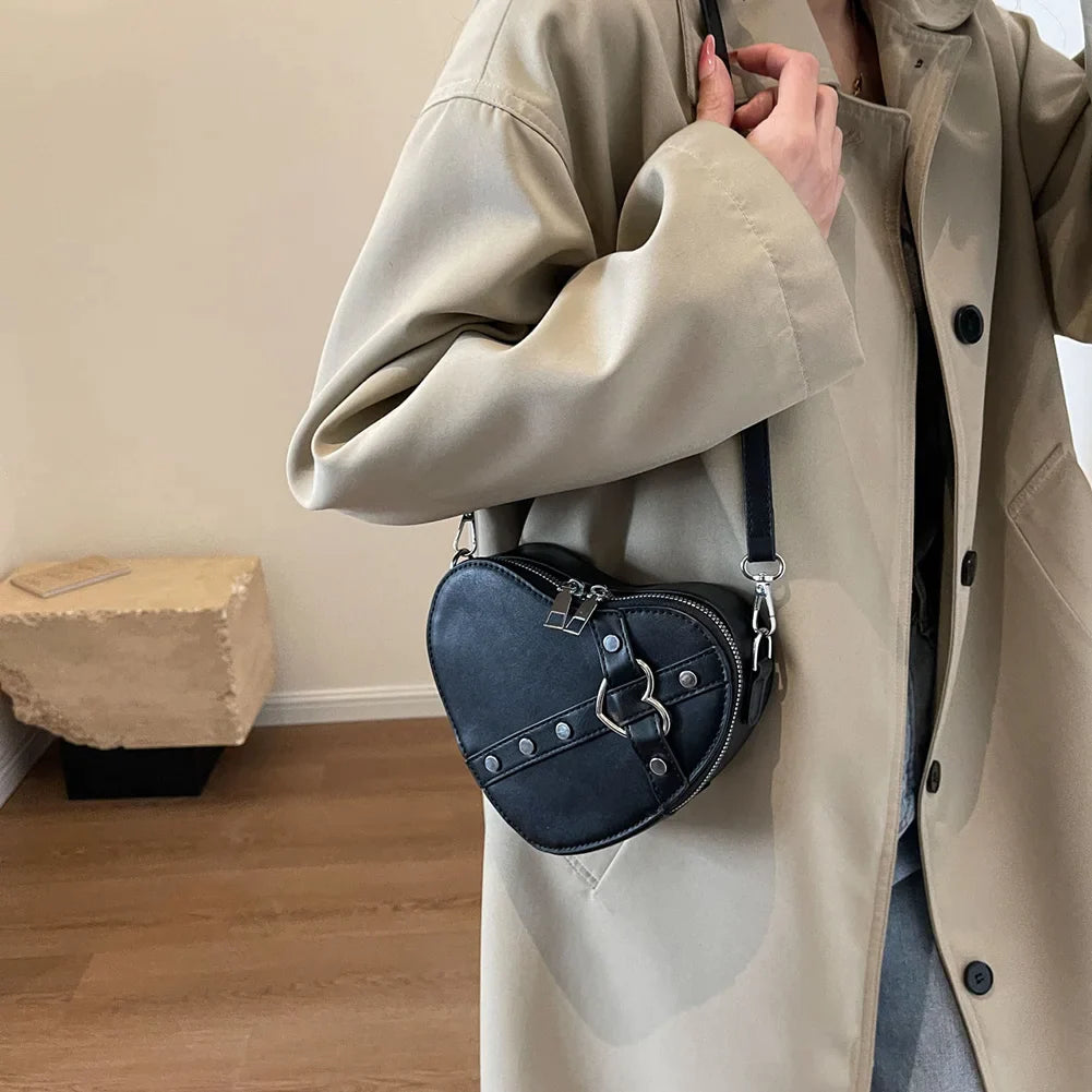Women Heart Shape Sling Bag PU Leather Small Heart Rivet Bag Solid Color Adjustable Strap Female Outdoor Bag Note: