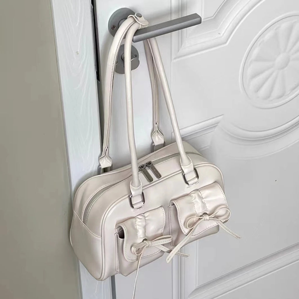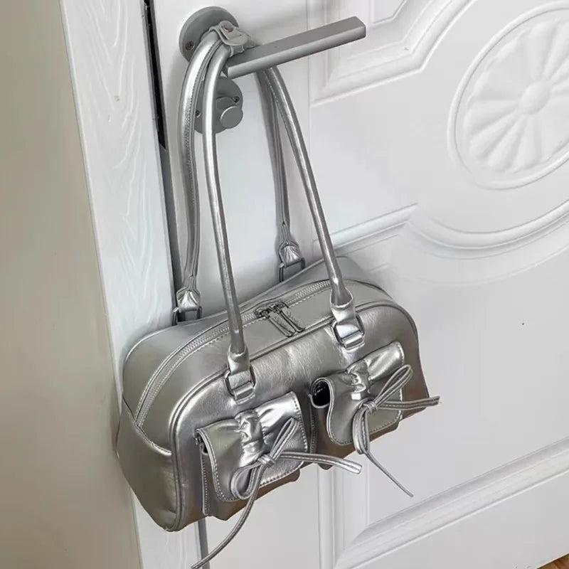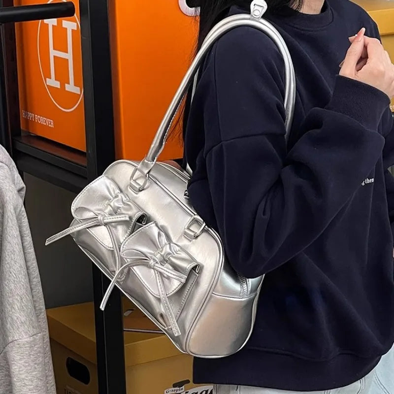 Silver Pleated Womens Shoulder Bag Elegant Gentle Korean Fashion Leather Handbag Bow Sweet New Simple Ladies Boston Bag