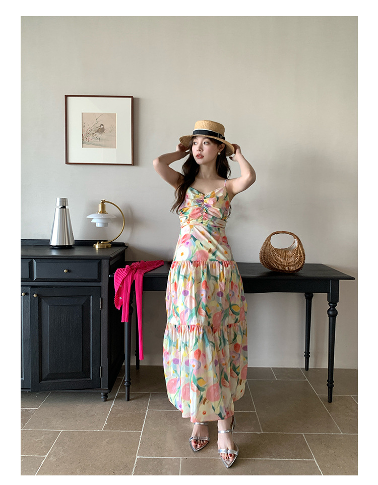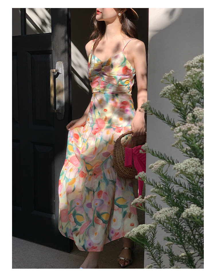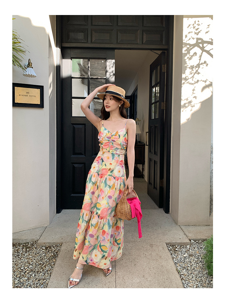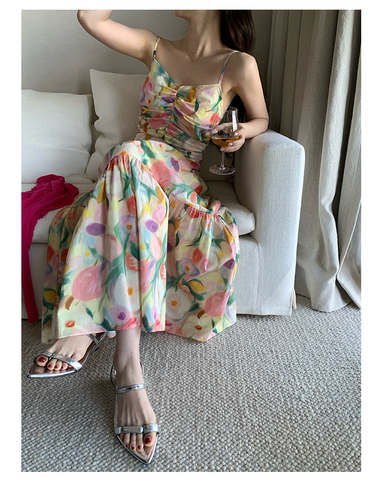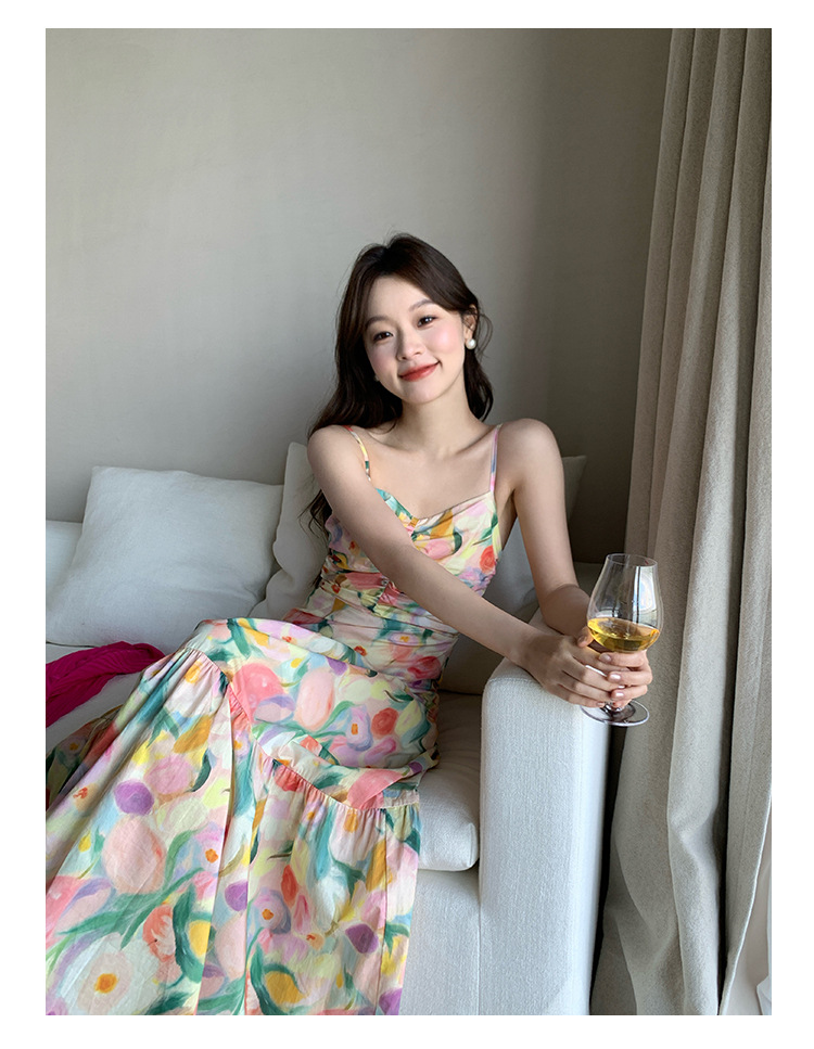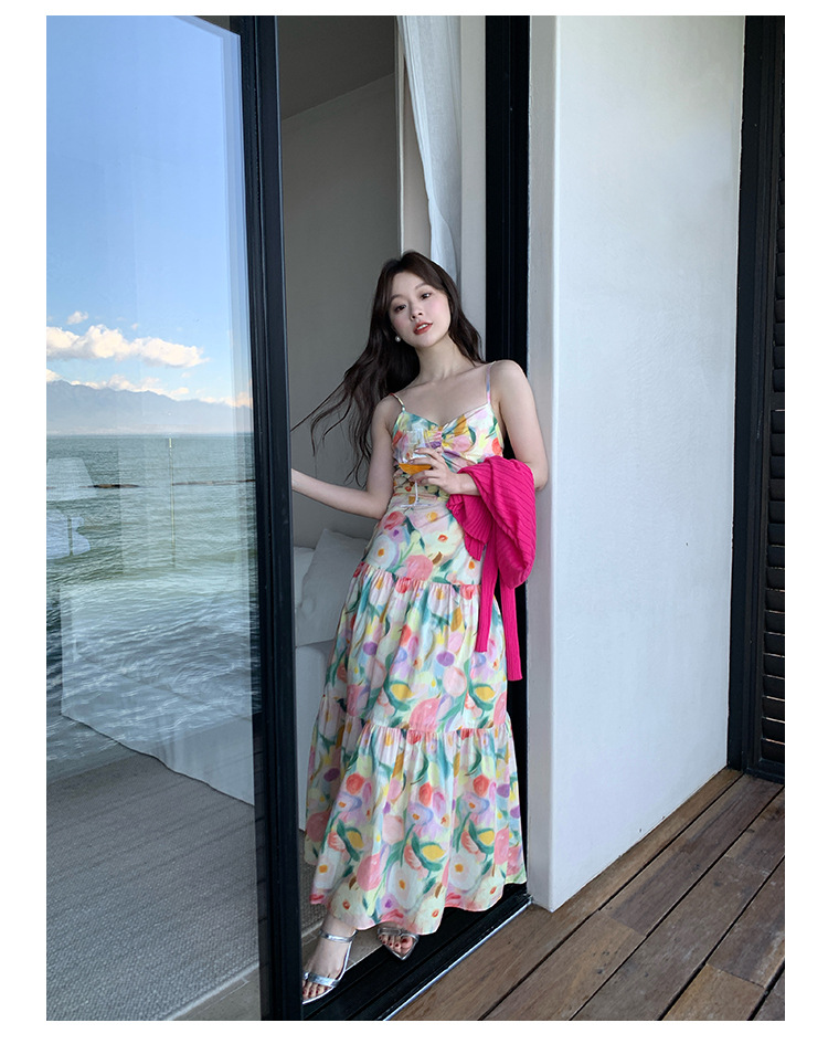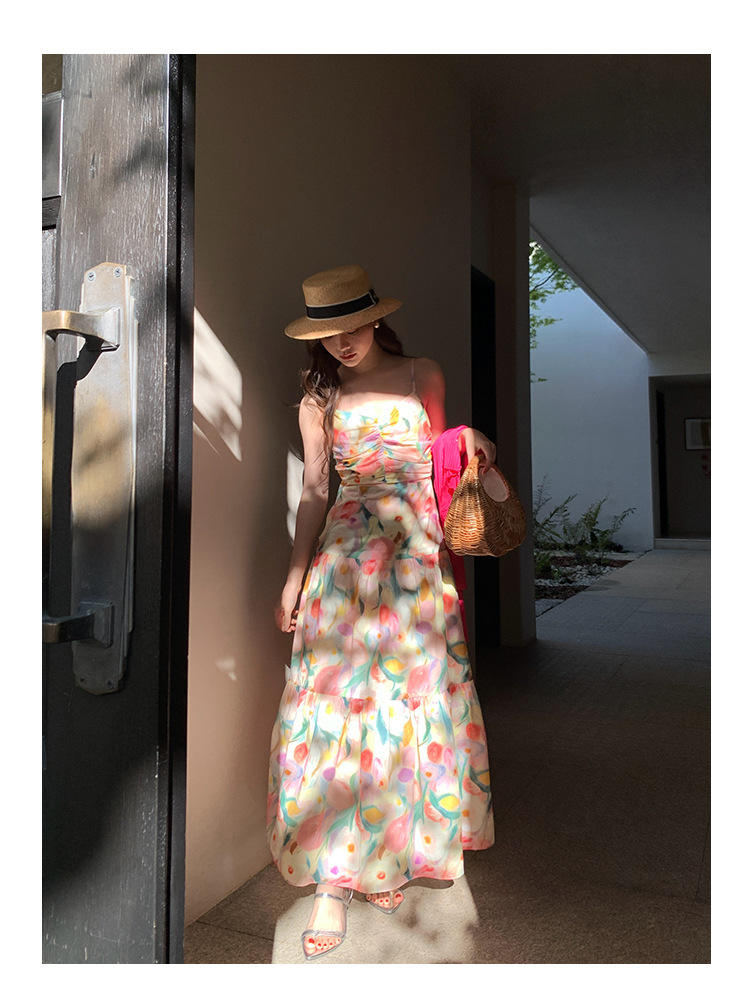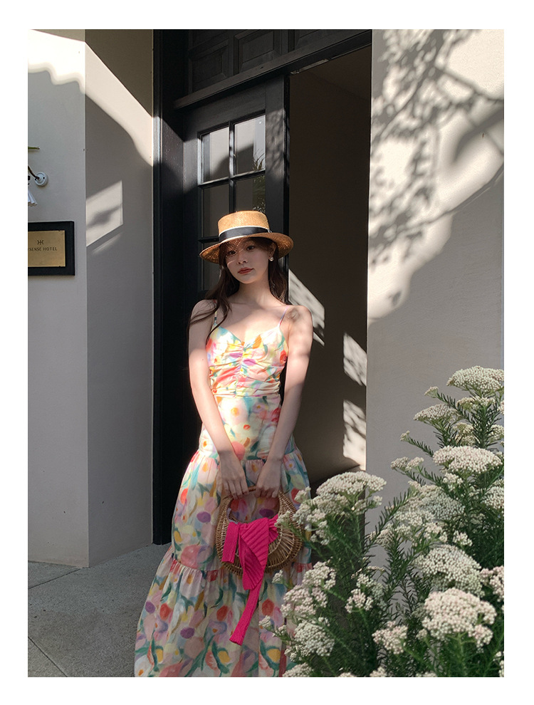 summer French pastoral holiday style oil painting high waist sling dress