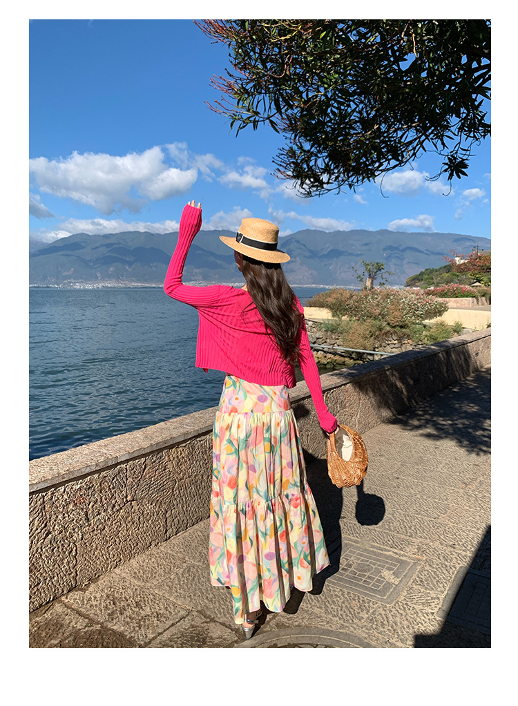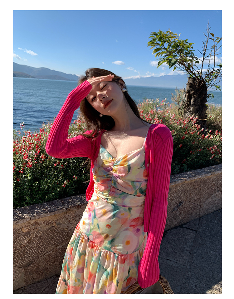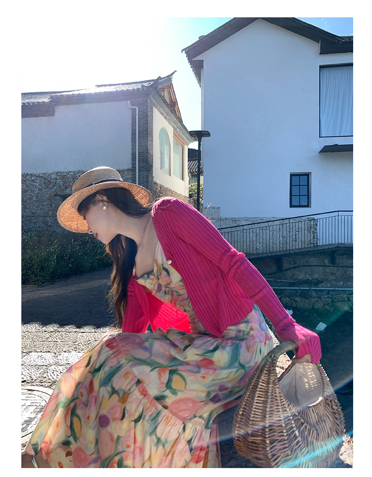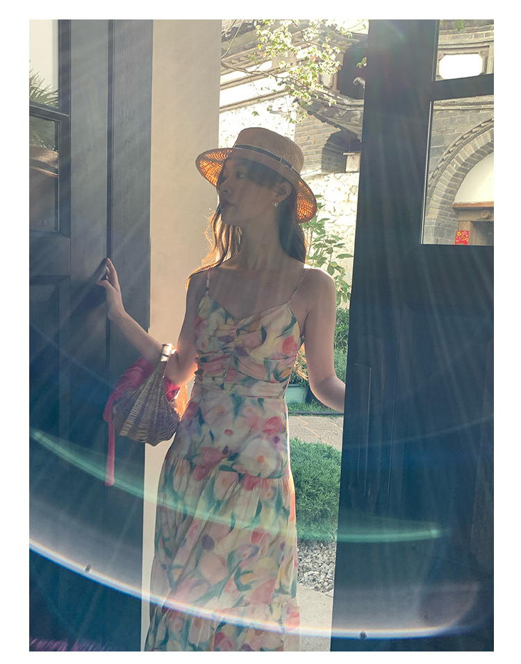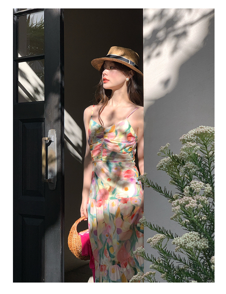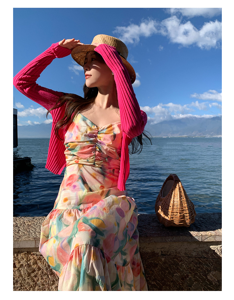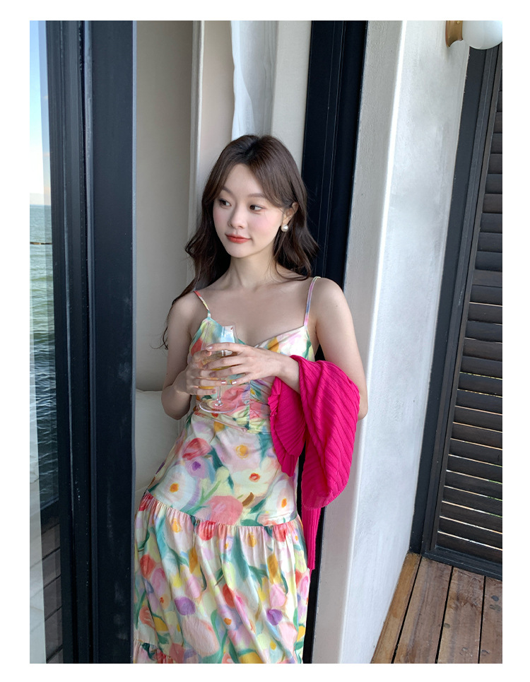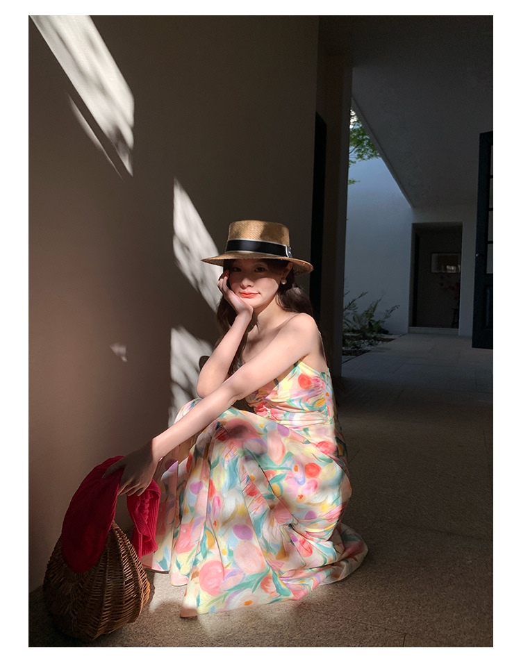 summer French pastoral holiday style oil painting high waist sling dress