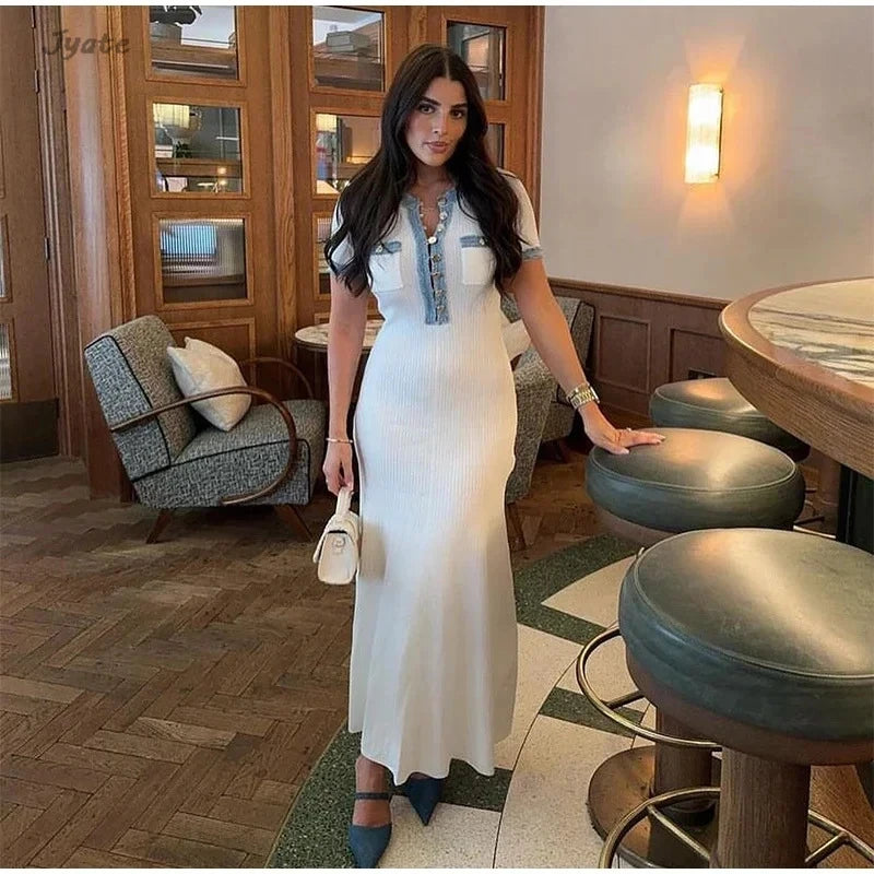 Denim Patchwork Kinitting Fashion Long Dress Tight Single Breasted Chic White Women Dress Versatile Street Summer Spring Vestido