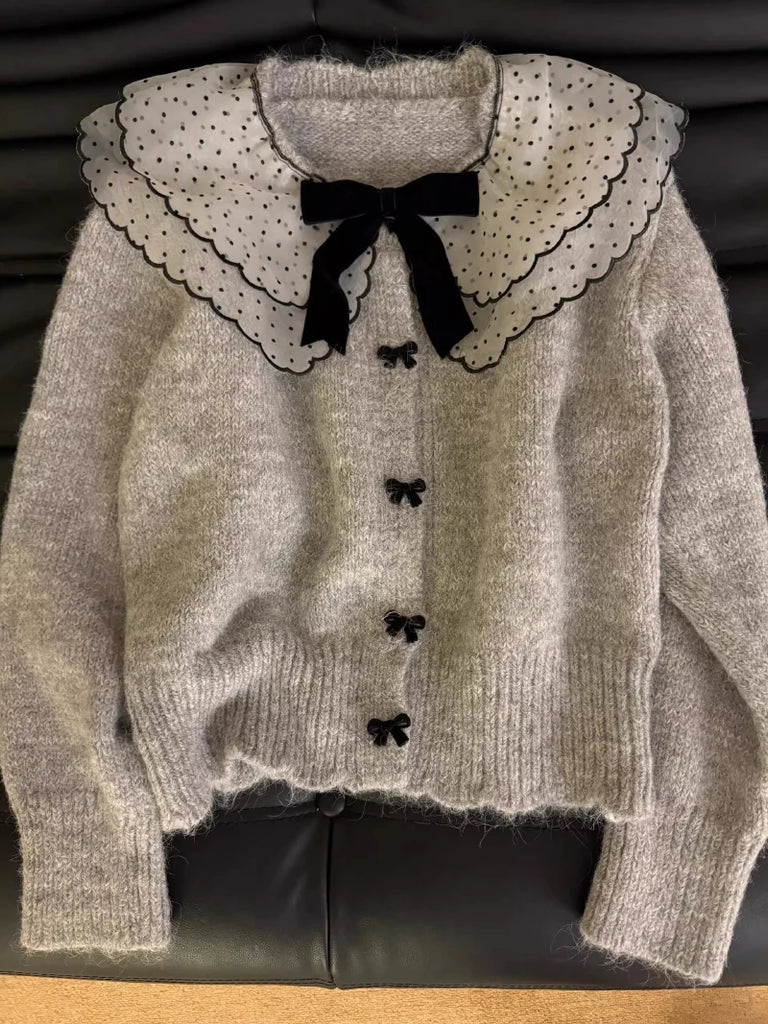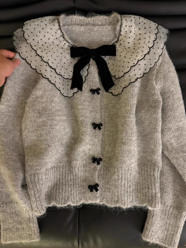 Bomon Autumn/Winter Knit Top Loose And Lazy Autumn/Winter Soft Waxy Grey Doll Collar Bow Sweater Cardigan Coat For Women