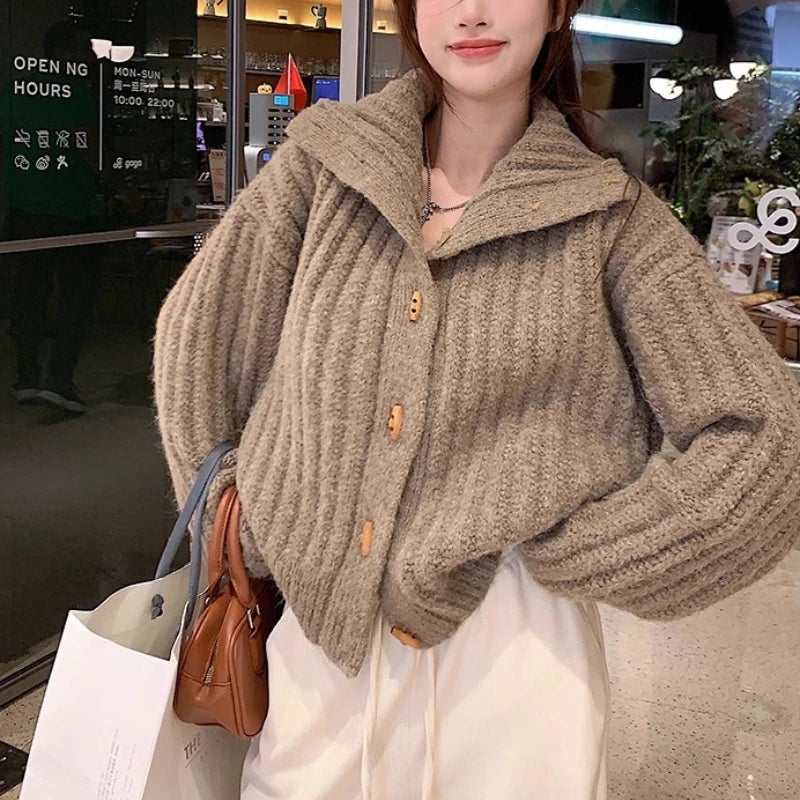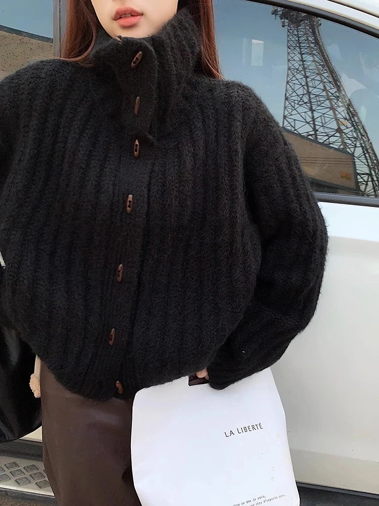 Chunky Knit Cardigan with Toggles High Neck Button-down Sweater Jacket Women Autumn Winter Warm Knitwear Vintage Outfit