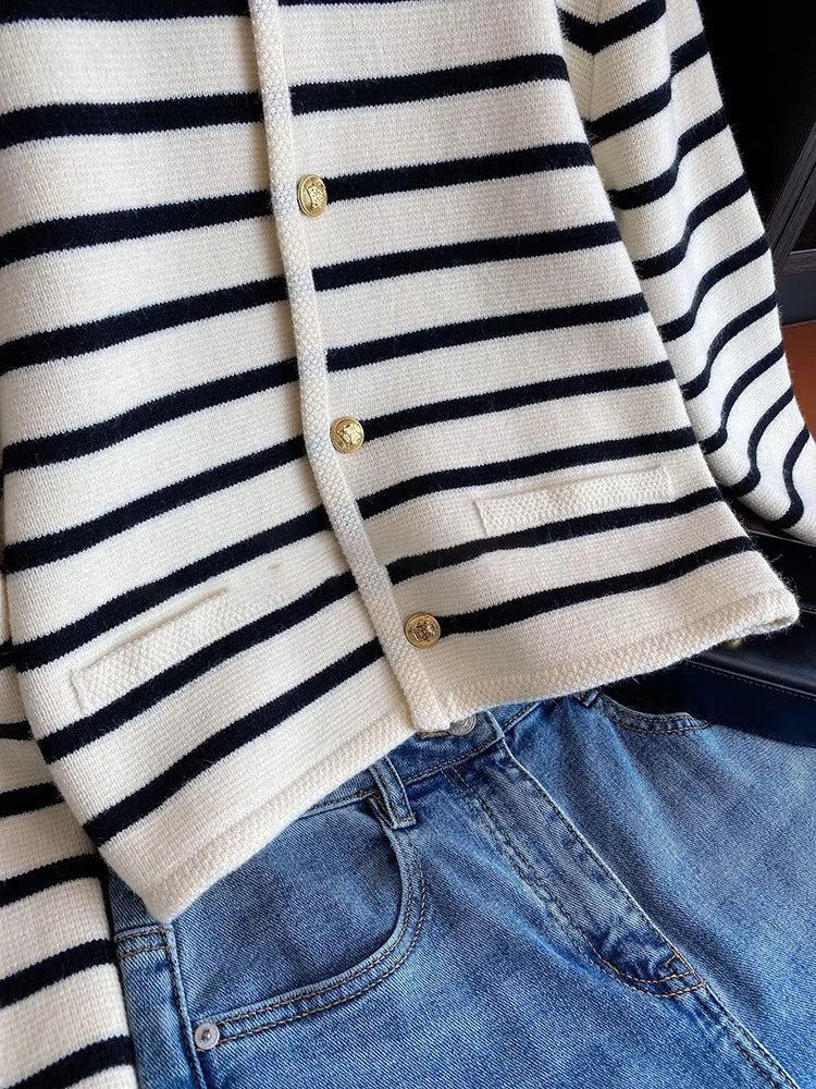 Pbong Sweet Sle ort Knitted Sweater Cardigan Women's Soft Stripe Color Blo Autumn New Faion Anti-Aging round Ne