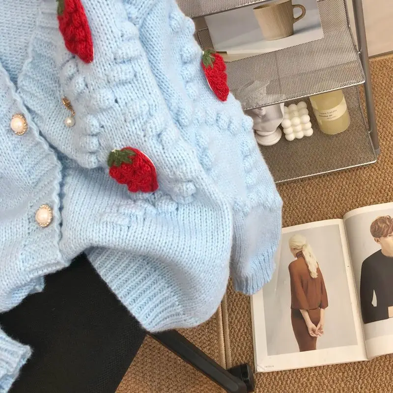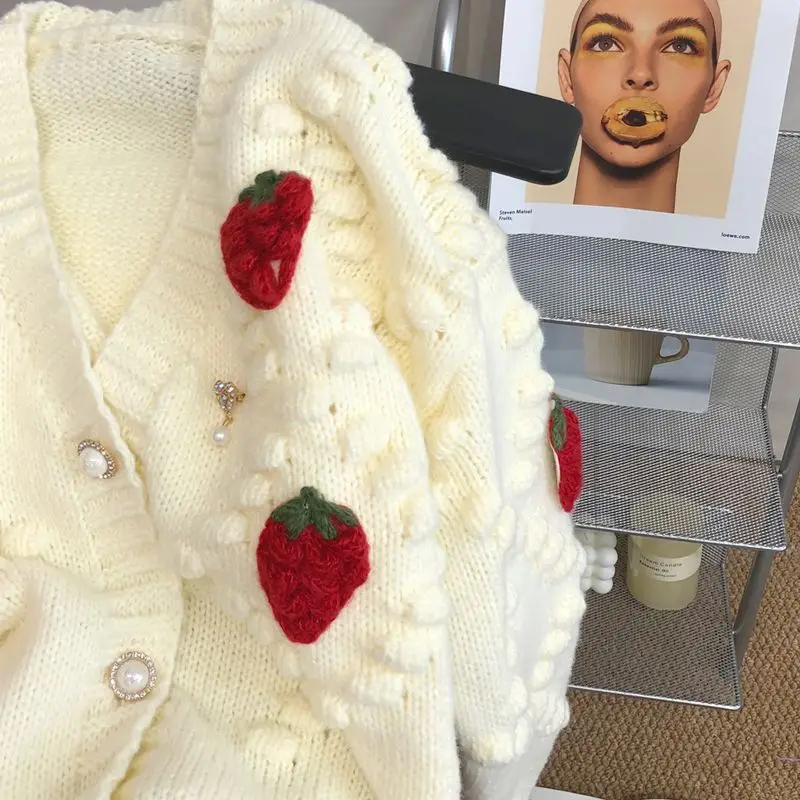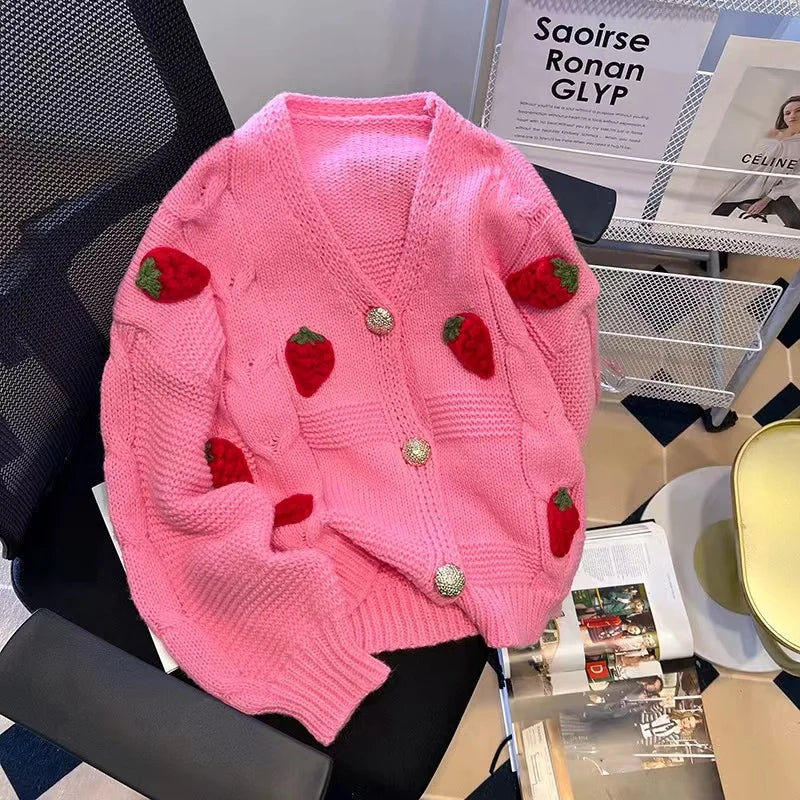Sweet Strawberry Embroidered Sweater Coat for Women's Thickened New Soft Knitted Cardigan Single-breasted V-neck Loose Top