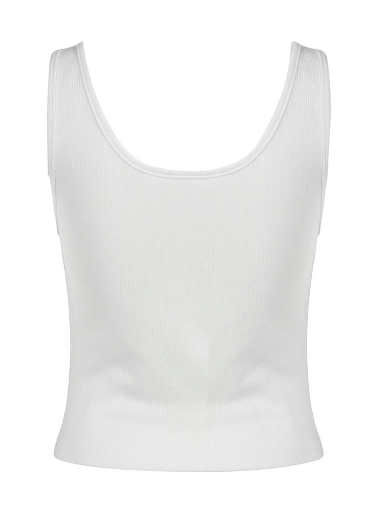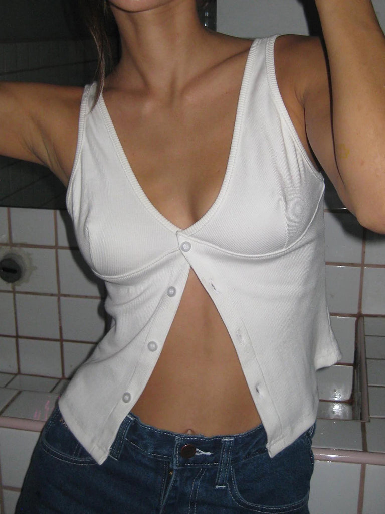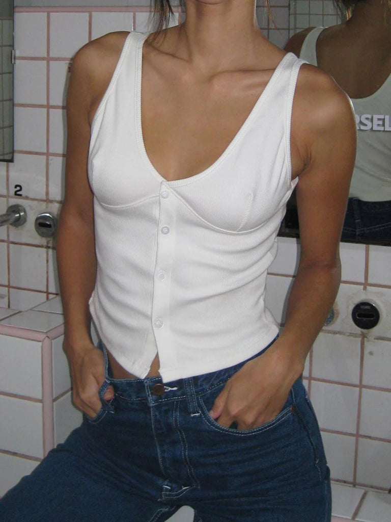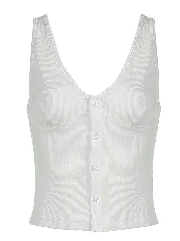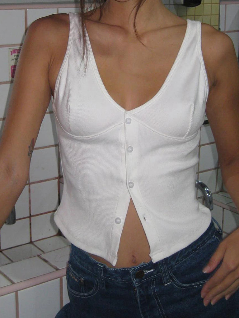 Sweetown Button Up V Neck Sleeveless Ribbed Vest White Solid Basic Casual Tank Top Women Elegant Fashion Crop Cardigan Shirts