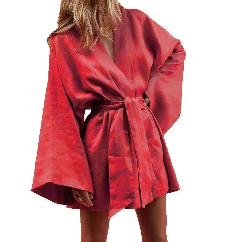 Women's V-Neck Kimono Cardigan Mini Dress Cotton Linen Long Sleeve Sashes Dresses Robe Style Lace Up Summer Loose Vestidos