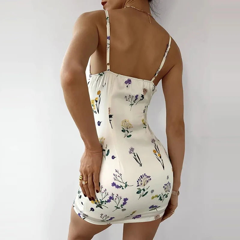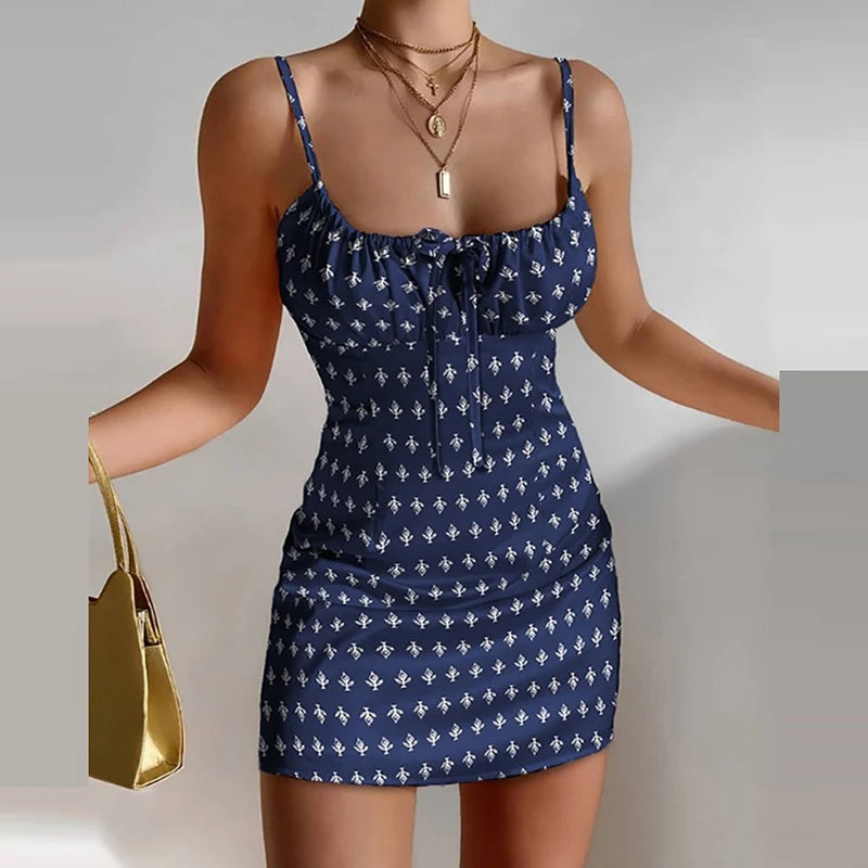 Casual Floral Print Mini Dresses Women Sexy Sleeveless Slim Sling Vestidos Summer Lady Fashion Lace Up Square Collar Party Dress