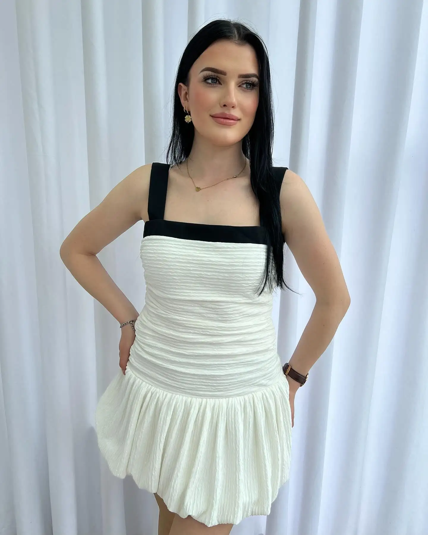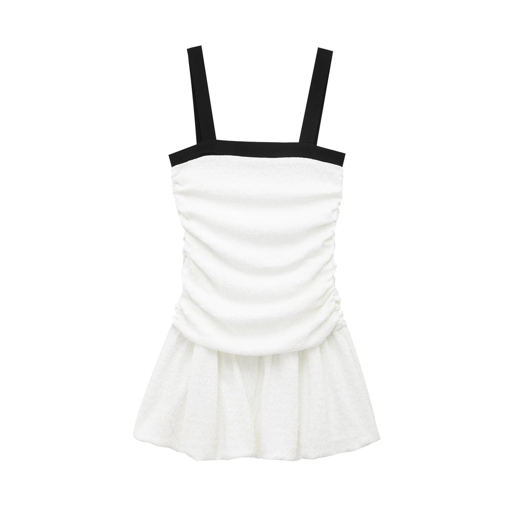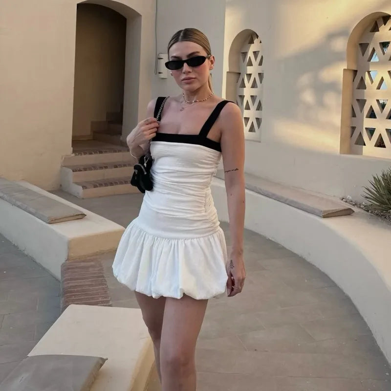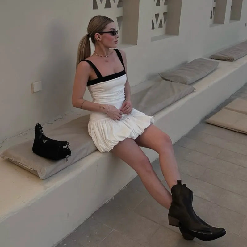 Patchwork Black White Casual Short Dress 2025 Summer New Sqaure Collar A-line Fashion Slip Dress Pleated Streetwear Women Dress