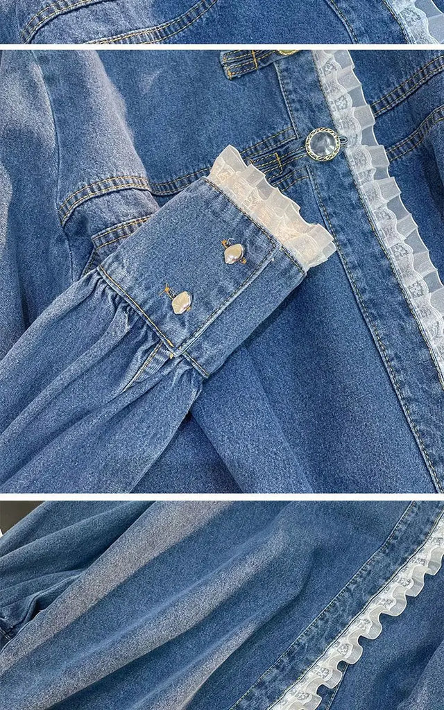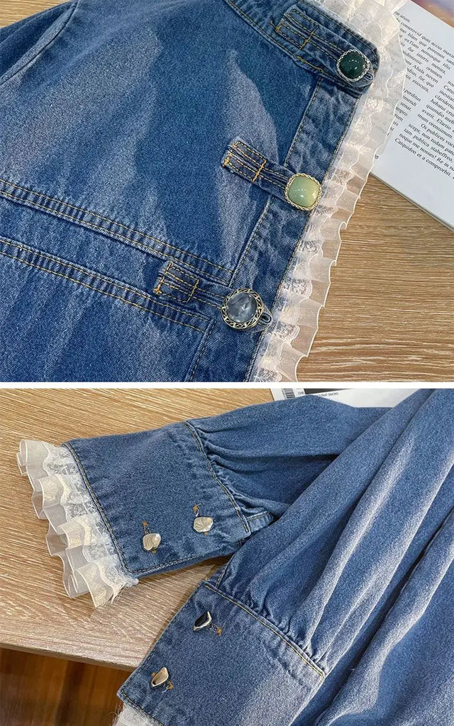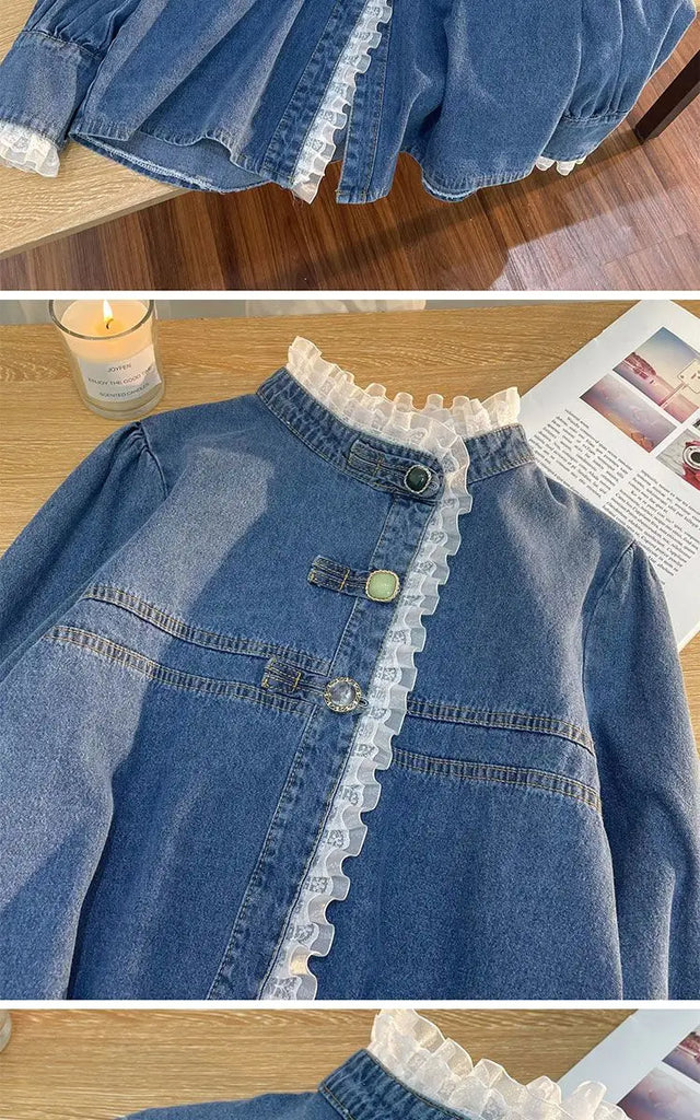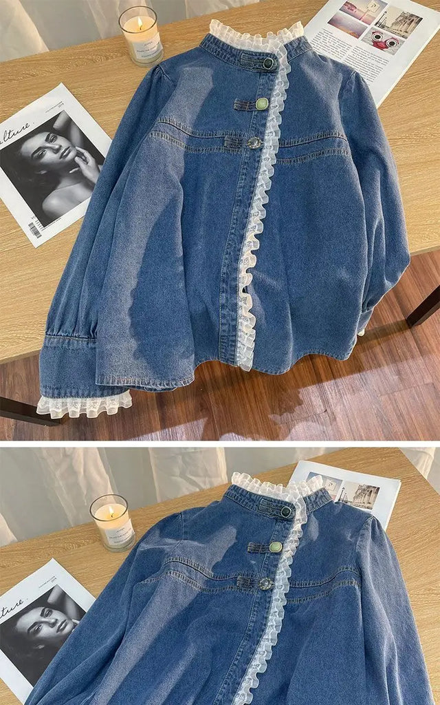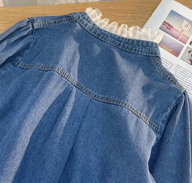 Fashion Lace Denim Shirt Women Clothing Autumn/Winter Retro Loose Casual Jackets Ruffled Collar Long Sleeve Blouses Women Tops