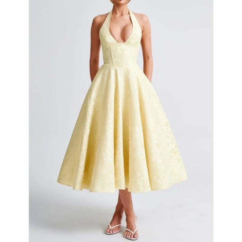 Elegant Sexy Evening Party Dresses Women Korean Style Halter V-neck Dress Sweet Backless Yellow Summer Solid Midi Dress