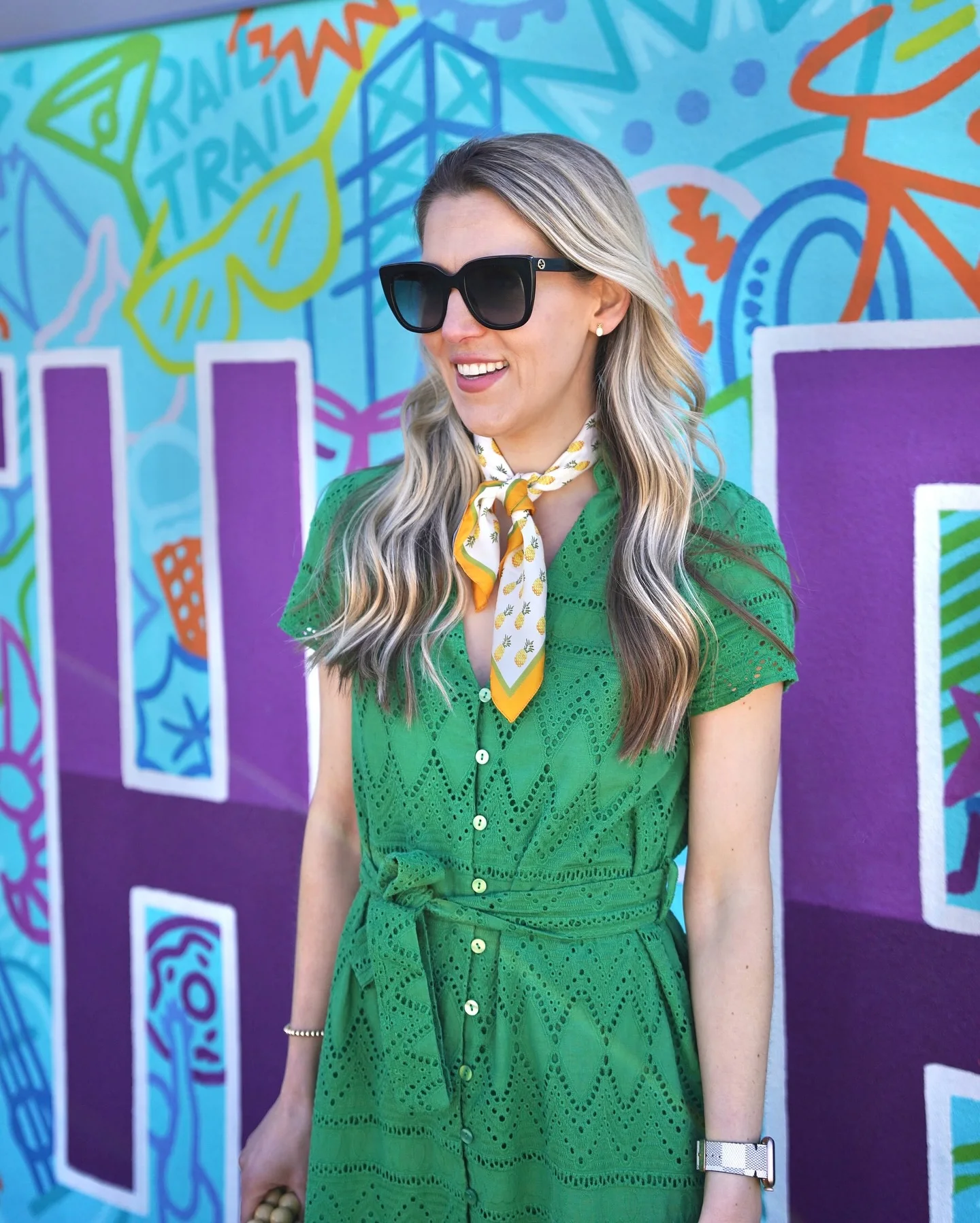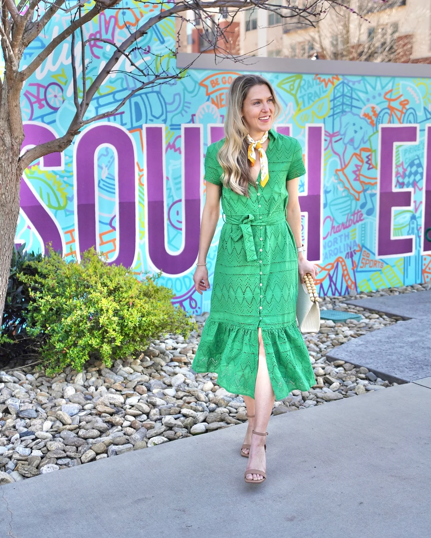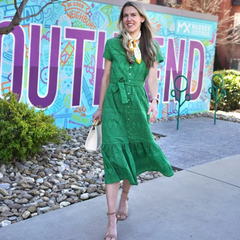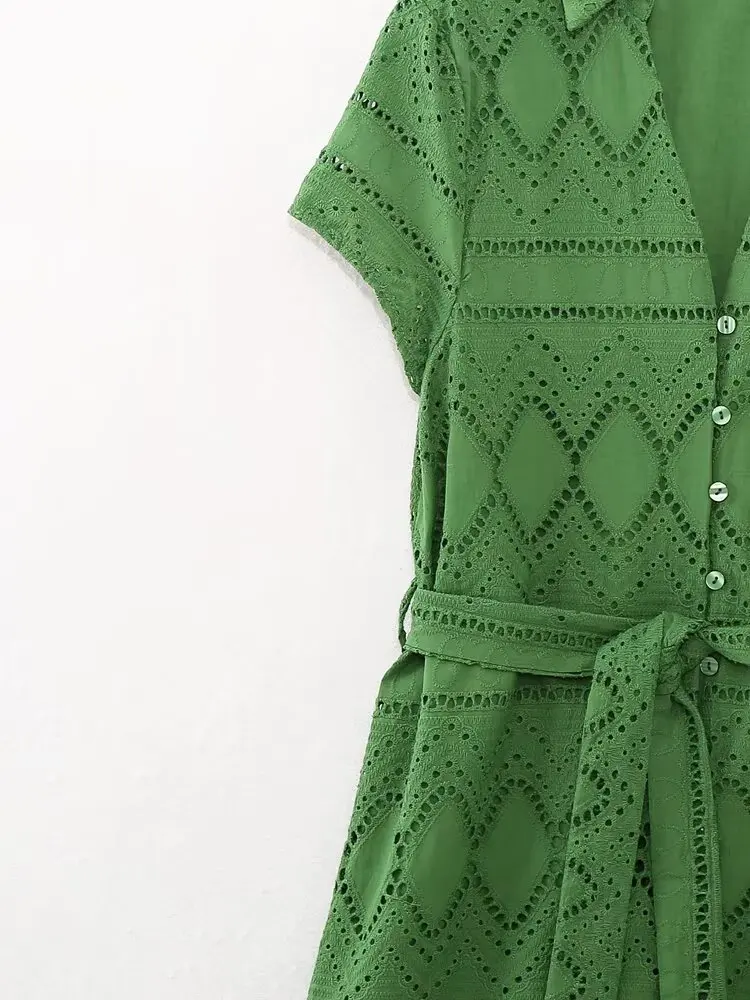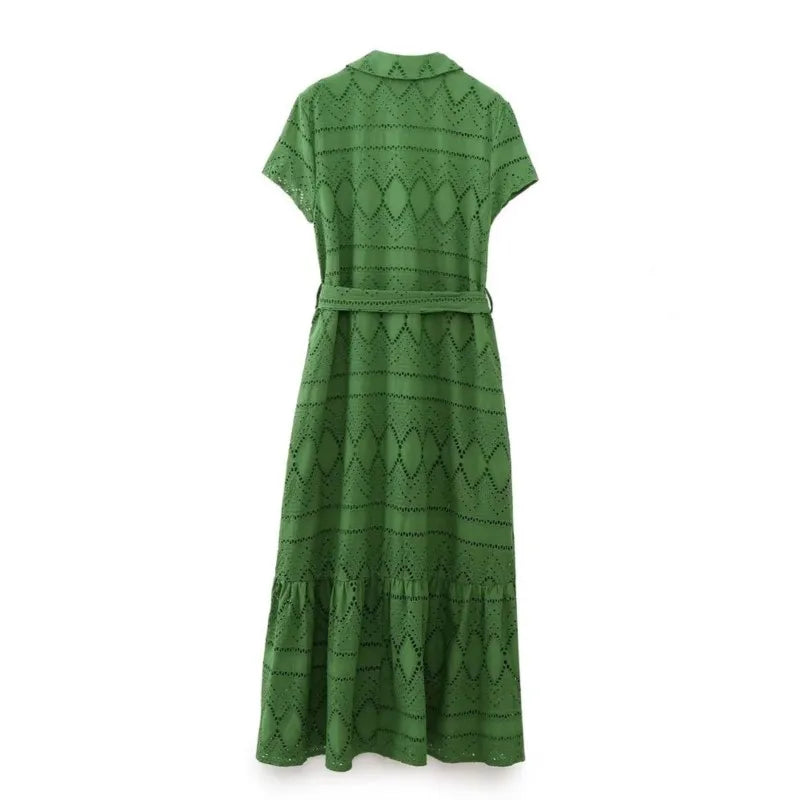 Fashion Hollow Out Embroidery Belt Long Dress Turn Down Collar Solid Color Green Elegant Women Dress 2025 New Chic Vestidos