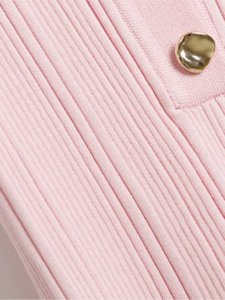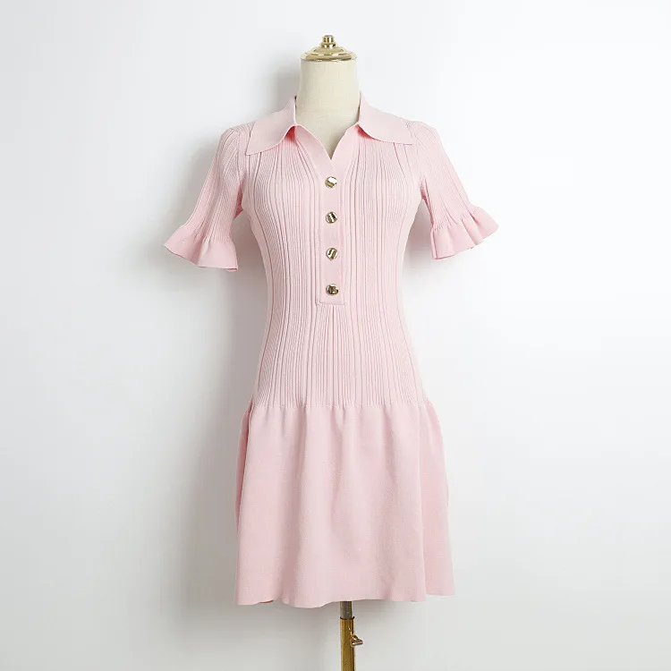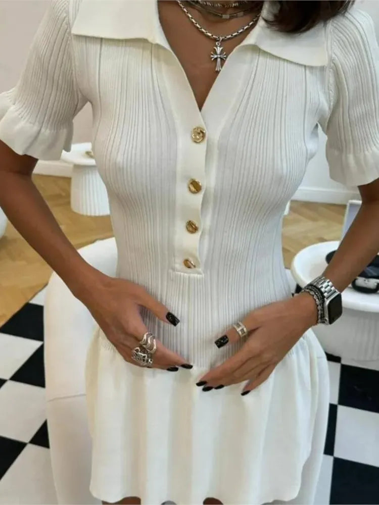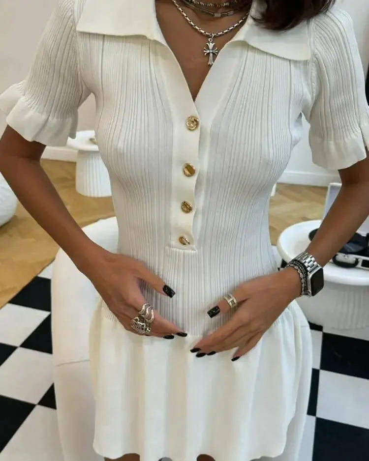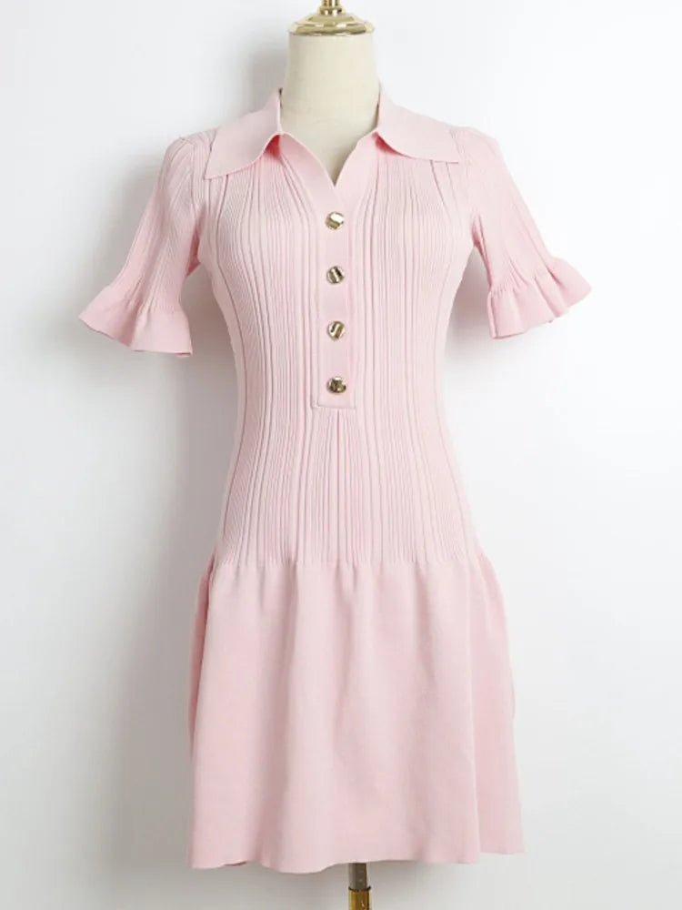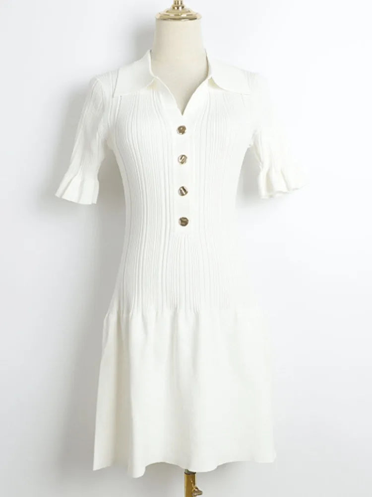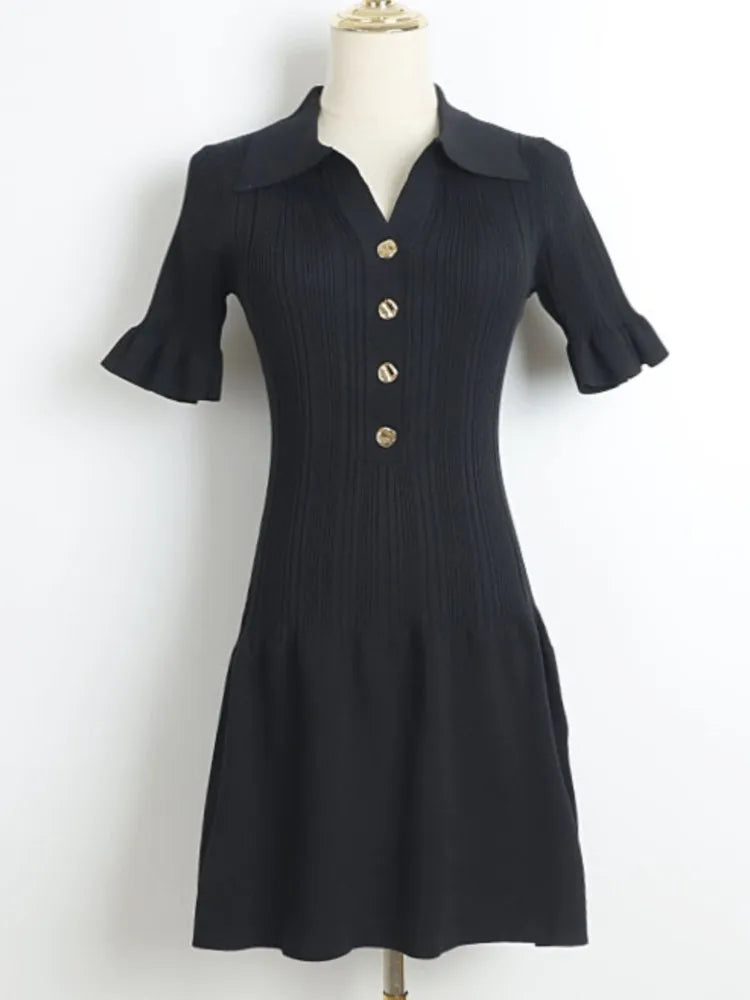 Lapel Ruffle Kintting Short Dress For Women Elegant Fashion A-line Summer Dress Metal Button Solid Chic Femme Vestidos 2025 New