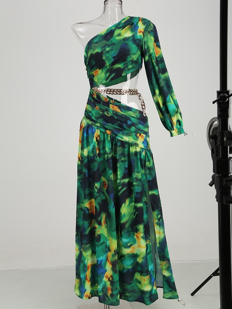 Sexy Slanted One Shoulder Slim Chain Floral Maxi Dress Summer Elegant Floral Irregular Cut Out Long Sleeve Dress Party Evening