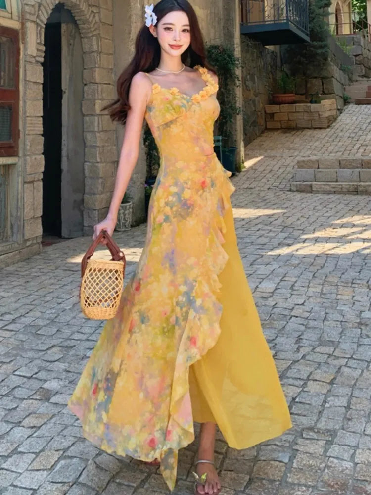 Women Holiday Beach Print Floral Ruffled Long Dress V Neck Sleeveless Spaghetti Strap Fairy Dress Elegant Evening Party Vestidos