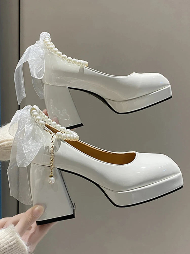 Ladies High Heels Elegant Bow Square Toe Black Fashion Women's Pumps Thick Heel Wedding Party Pearl Lace Wedding Shoes for Women