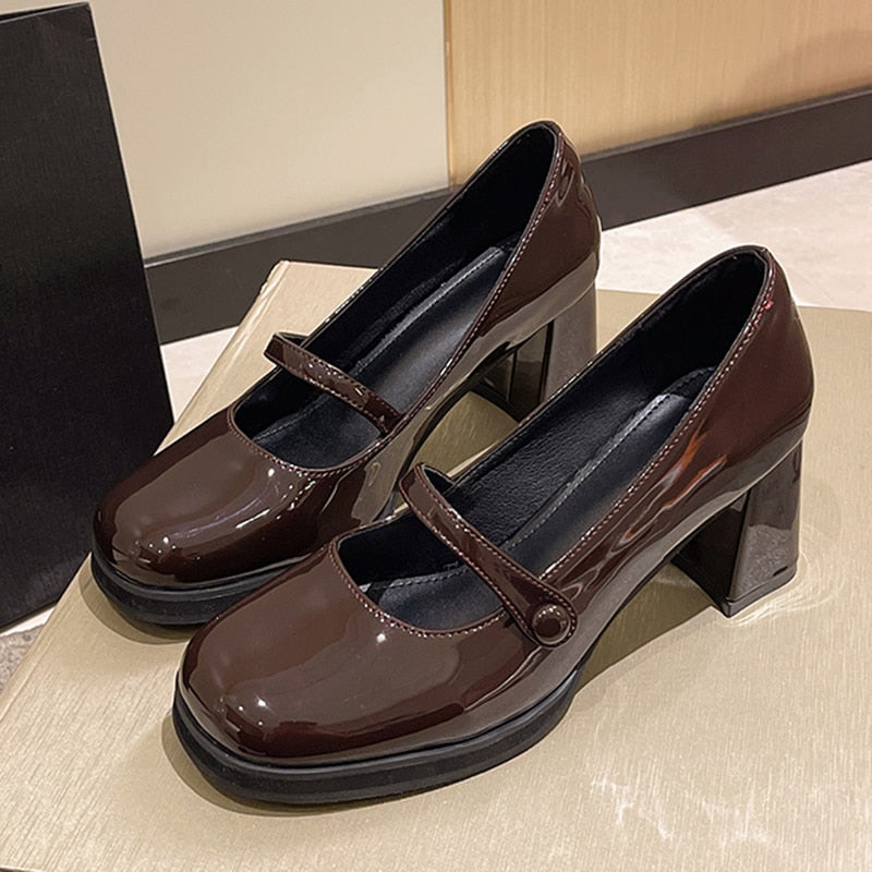 Lucyever Vintage Thick High Heels Mary Jane Shoes Women Patent Leather Brown Shoes Woman Round Toe Chunky Heels Pumps Mujer