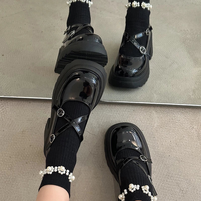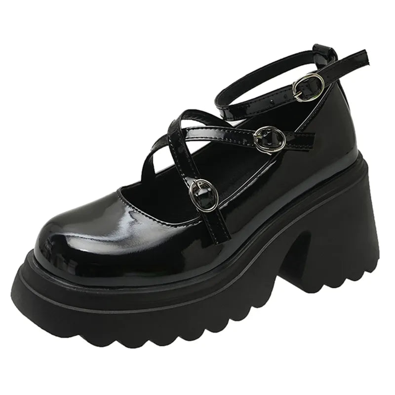 Patent Leather Ankle Strap Lolita Shoes Women Thick Heels Platform Mary Janes Woman Sweet Lovely High Heeled Pumps