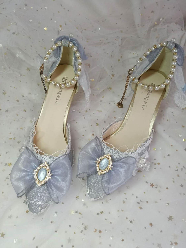 Princess kawaii shoes round head high heel Kawaii girl sweet lolita shoes pearl lace bowknot women shoes