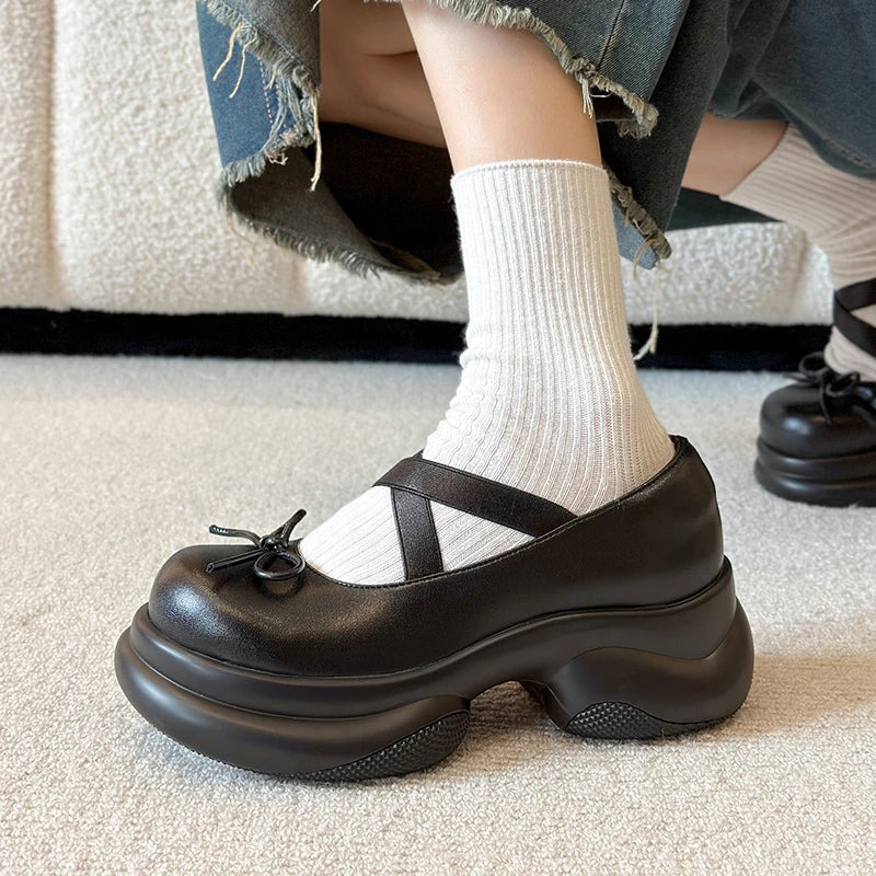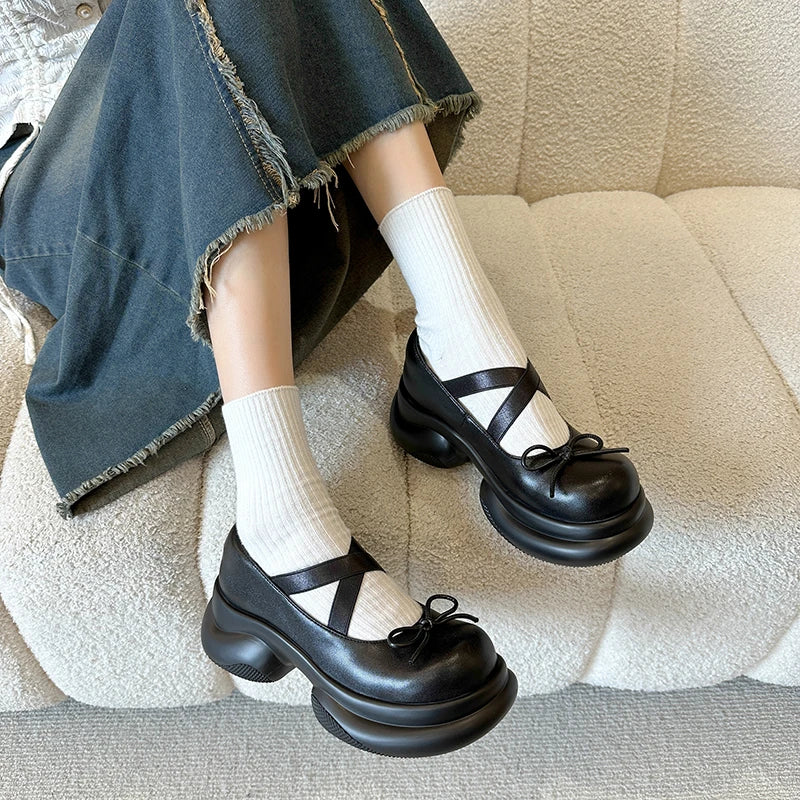 Silver High Heels Platform Pumps Women Autumn Bowtie Crossed Straps Mary Jane Shoes Woman Pu Leather Thick Heeled Jk Shoes