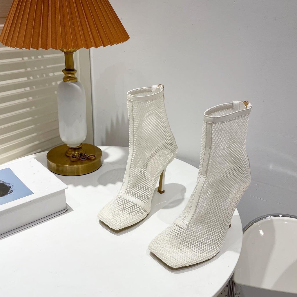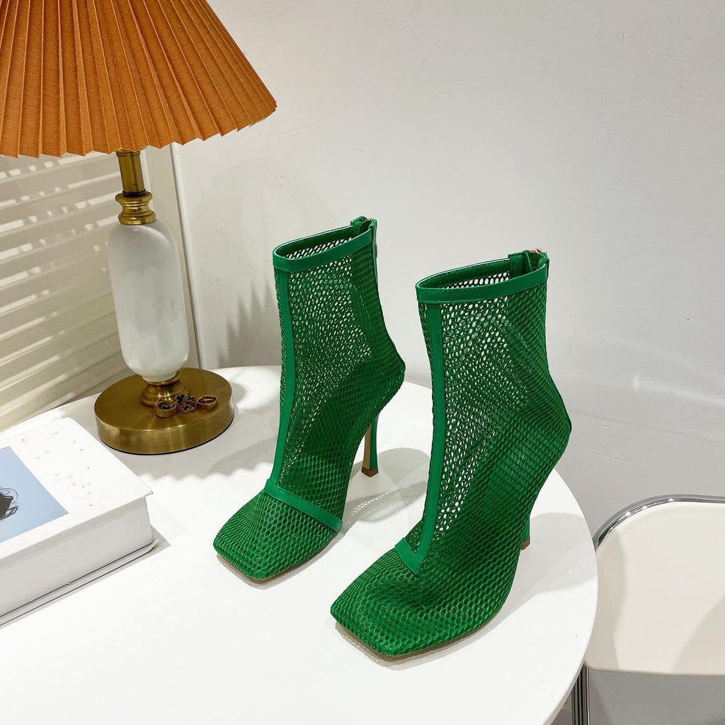 Summer New Fashion Sexy Square Head Mesh Zipper Dance Nightclub Green Shoes Women's High Heel Boots