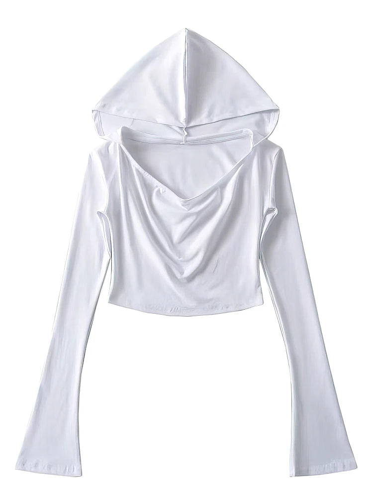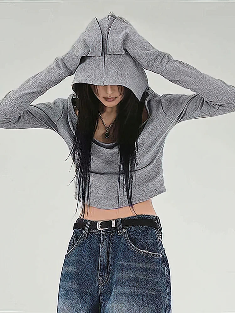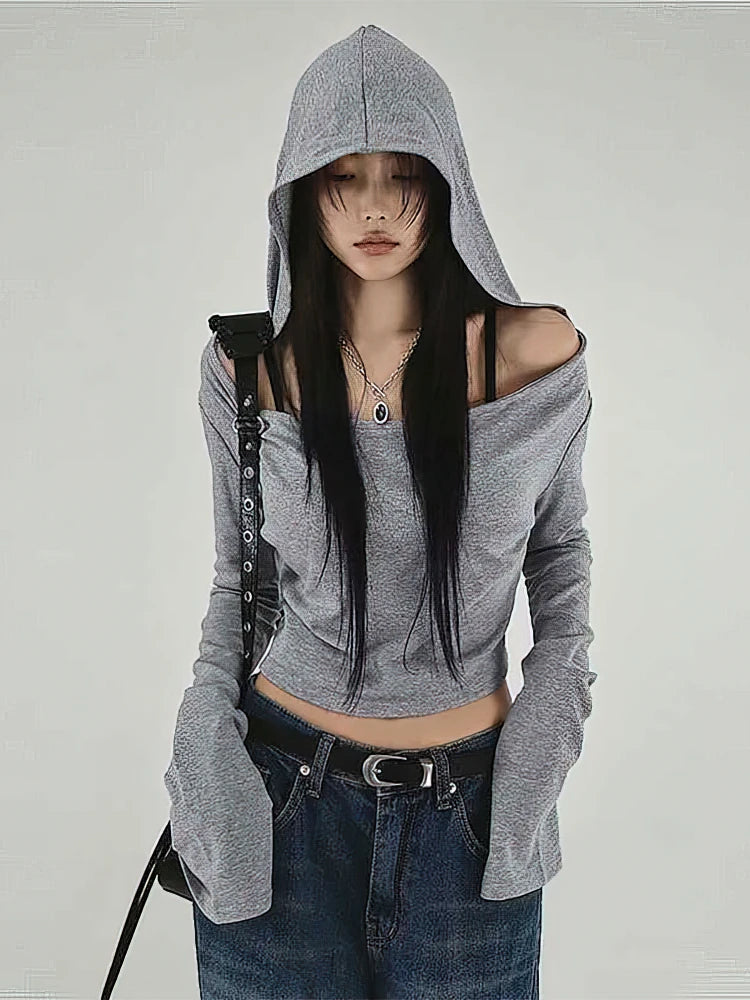 Vintage Hoodie Long sleeve T shirt Women Y2k Gray Off shoulder Top Sexy Cropped Tees Shirt Basic Blouse 2025 Fashion Streetwear