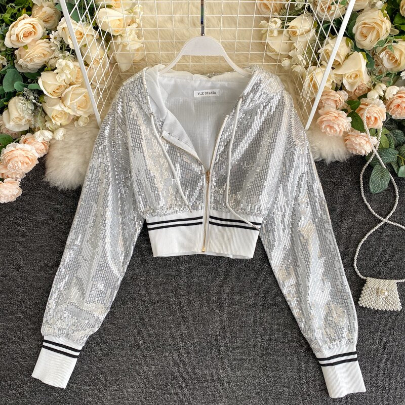 Bling Bling Sequined Short Design Summer Jacket Women Chic Hooded Bolds Sequines Jacket