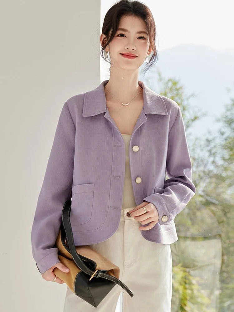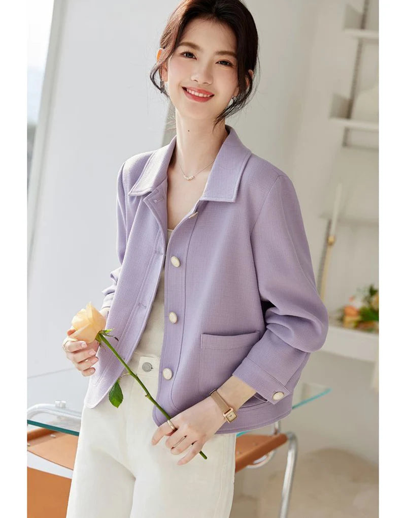 Elegant Slim Purple Jacket Women Sweet Long Sleeve Small Fragrance Coat Casual Fall Winter Lady French Pockets Fashion Tops
