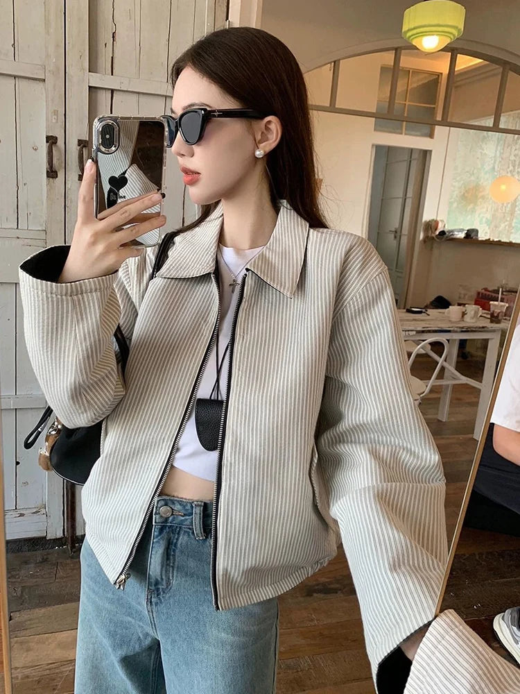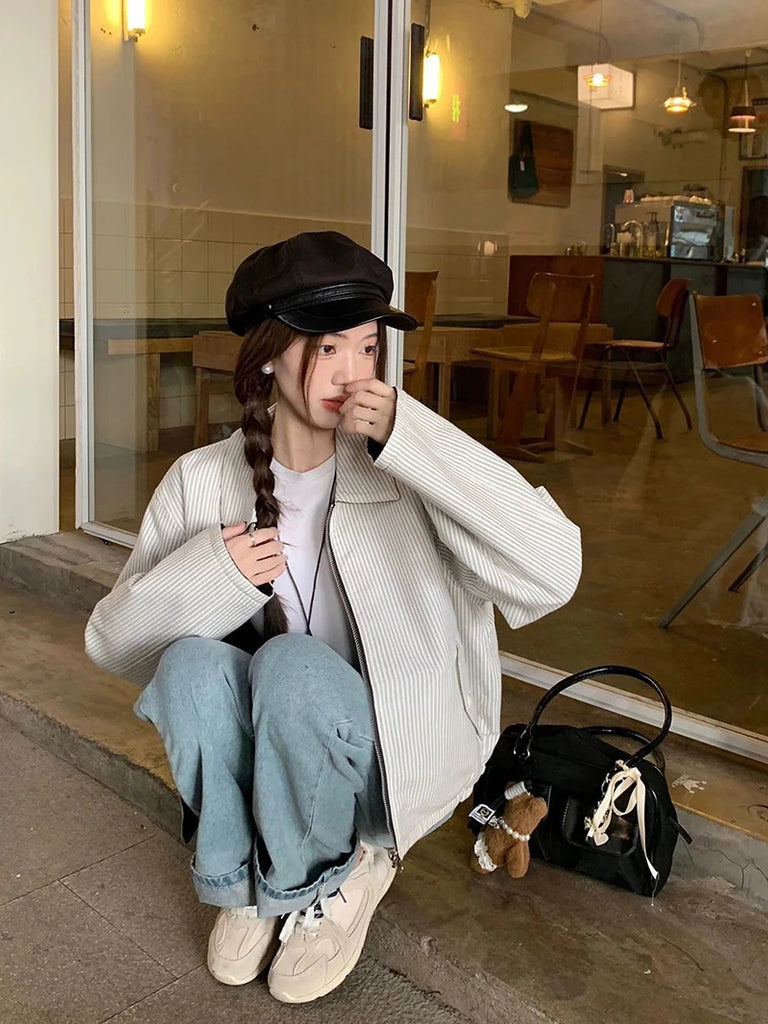 Striped Vintage Y2K Jacket Women Design Double Sided Wear Loose Streetwear Coat Casual American Fall Winter Long Sleeve Top