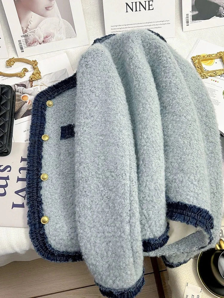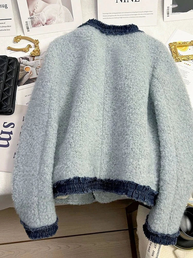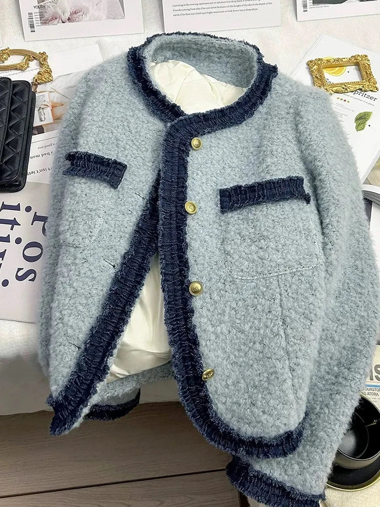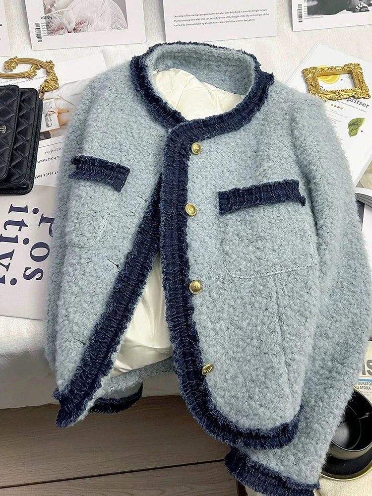 Sweet Thick Warm Tweed Jacket Women O Neck Long Sleeve Winter Cotton Coat Elegant Fashion Patchwork Korean Chic Outwear Top