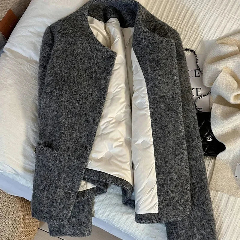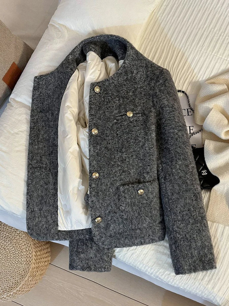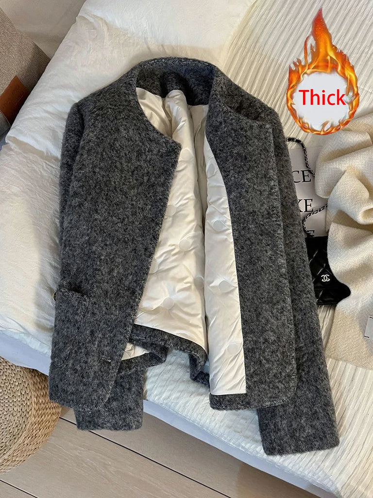 Vintage Faux Woolen Coat Women Warm Winter Thick Long Sleeve Gray Cotton Jacket Female Retro O Neck Pockets Casual Tops New