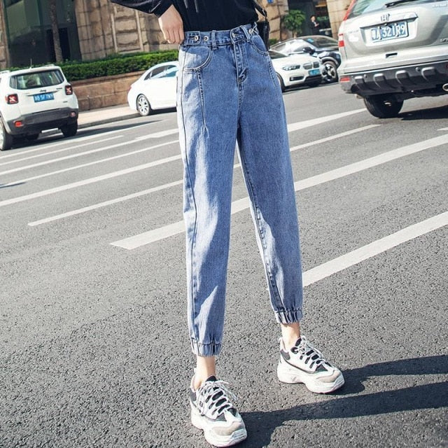 High waisted jeans women spring new loose tight fitting waist leggings feet thin nine points harem pants ins net red trend