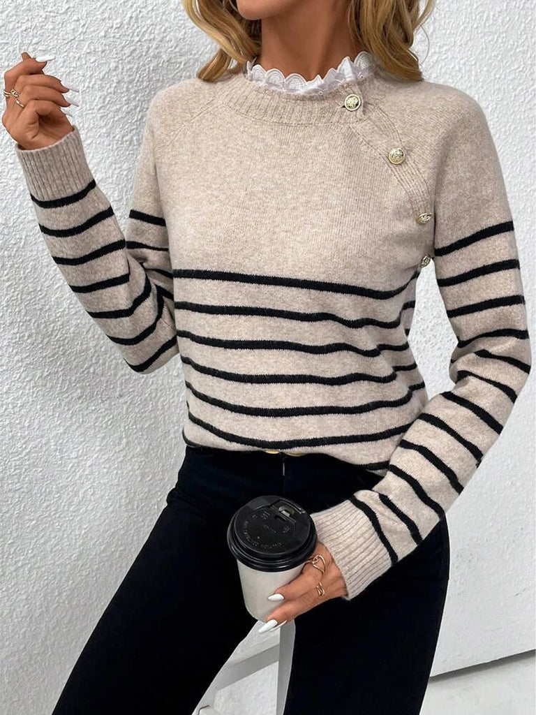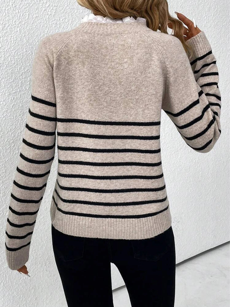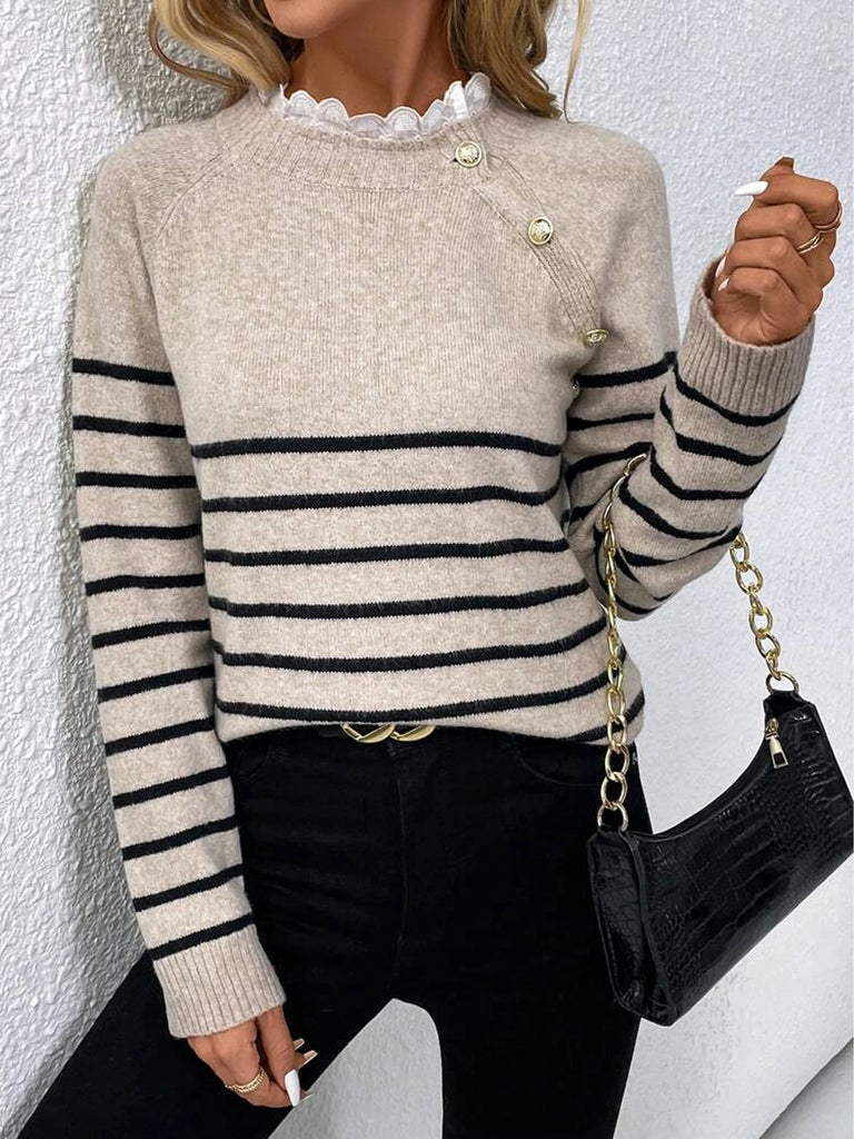 Autumn and winter women's fashionable lace round neck striped long sleeved knitted sweater