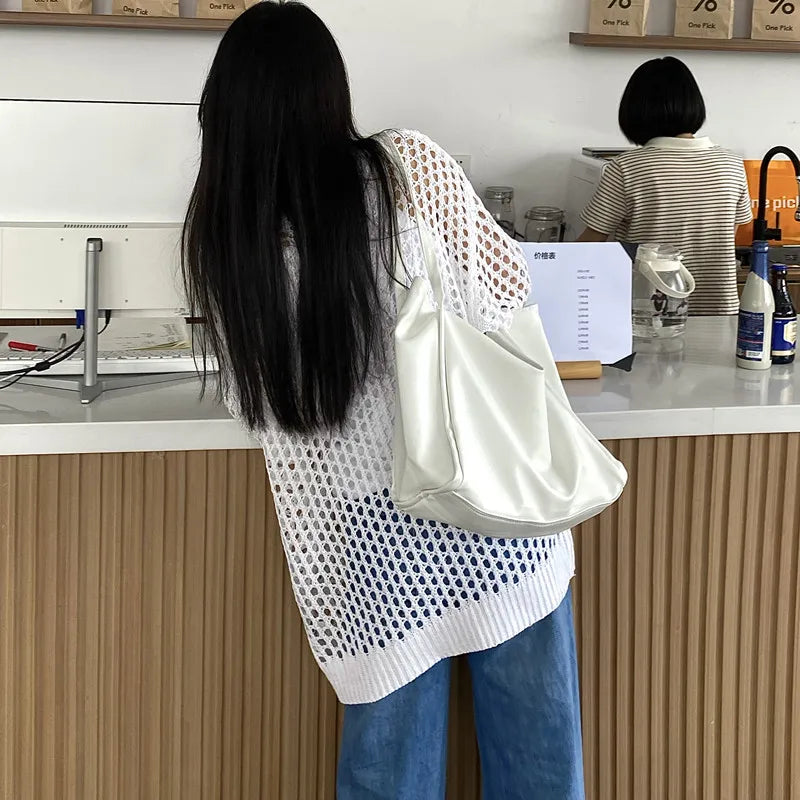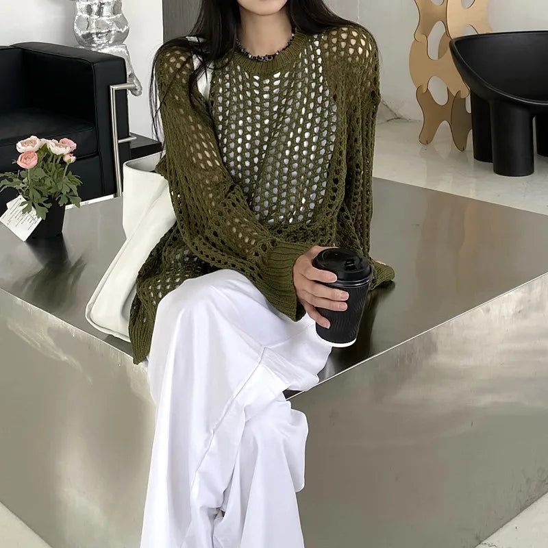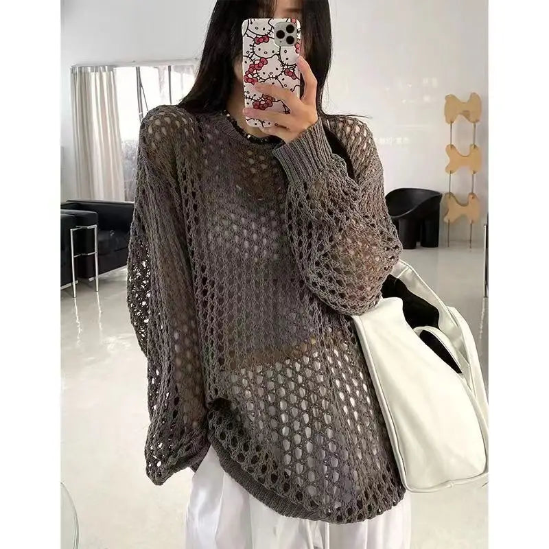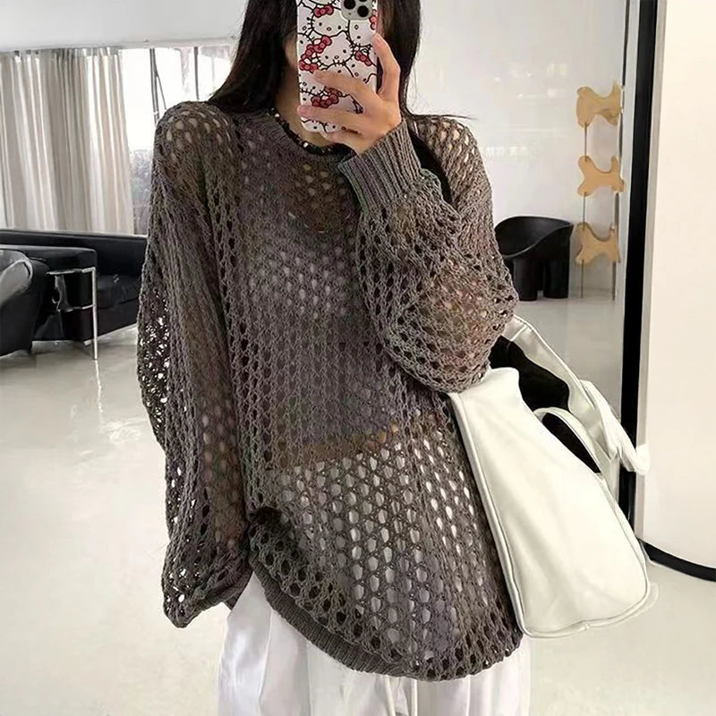 Oversized Crochet Top for Women Long Sleeve Crew Neck Casual Open-knit Sweater Pullovers Top Teen-girl Grunge Y2K Outfit