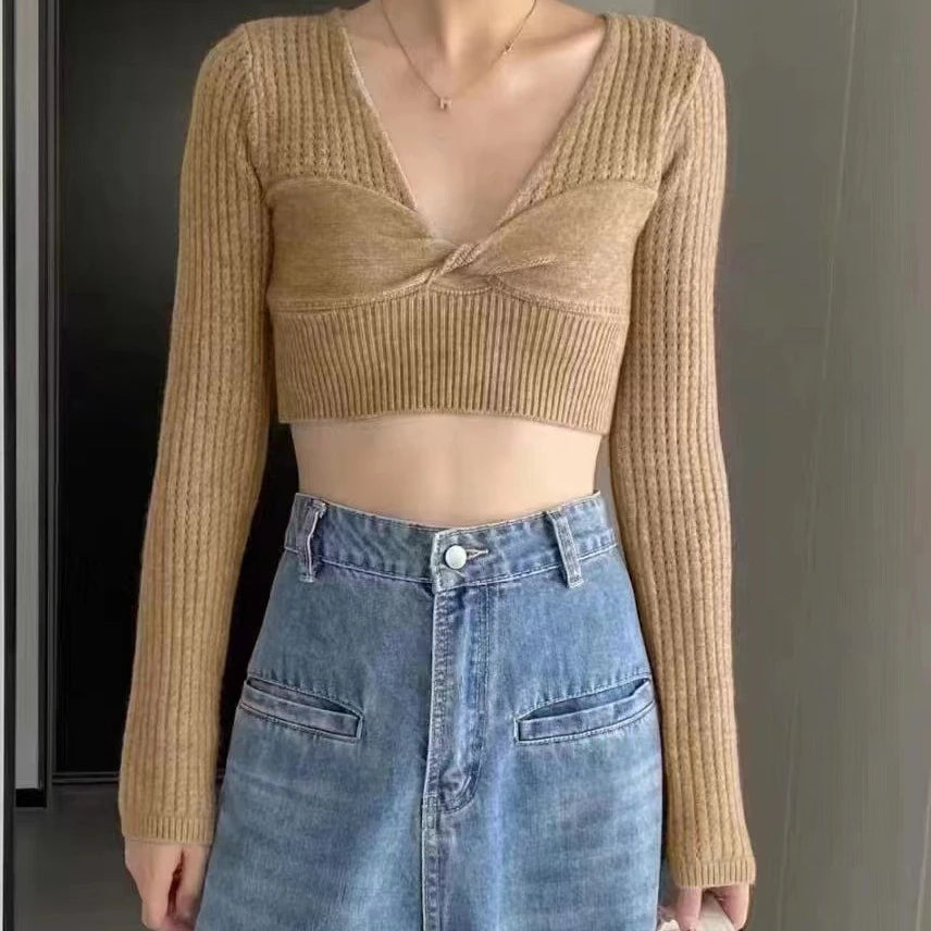Rib Knit Crop Top with Keyhole Criss-Cross Front Long Sleeve V-Neck Short Sweater Pullovers Women Teen-girl Y2K 90s Outfit