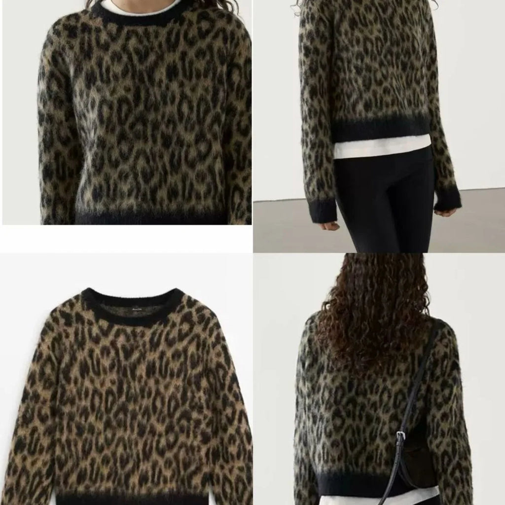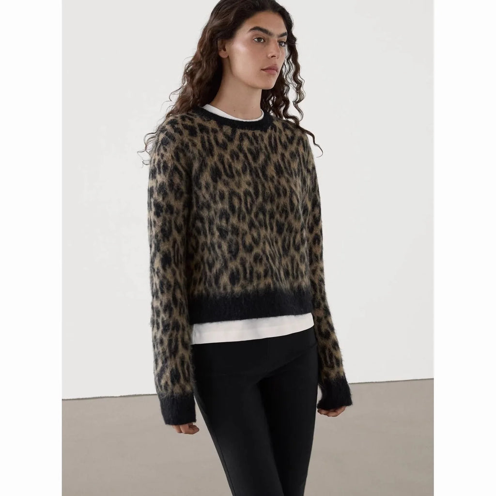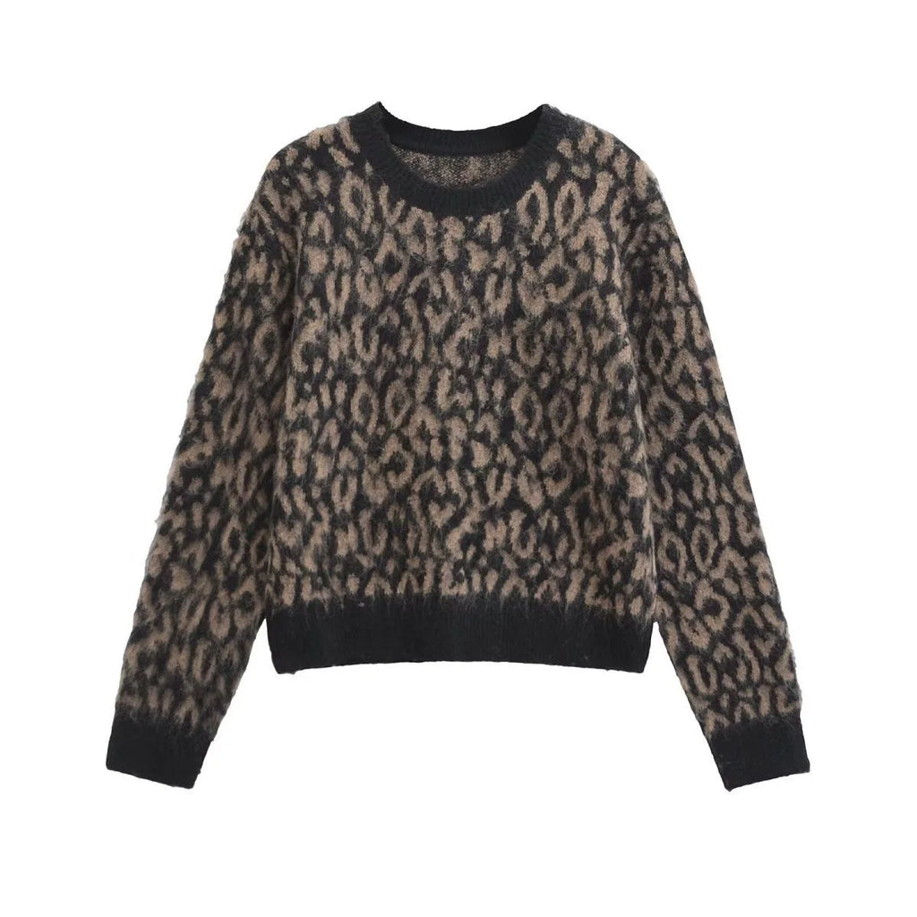 Spanish MD women's American retro brown leopard print round neck sweater knit top for autumn and winter