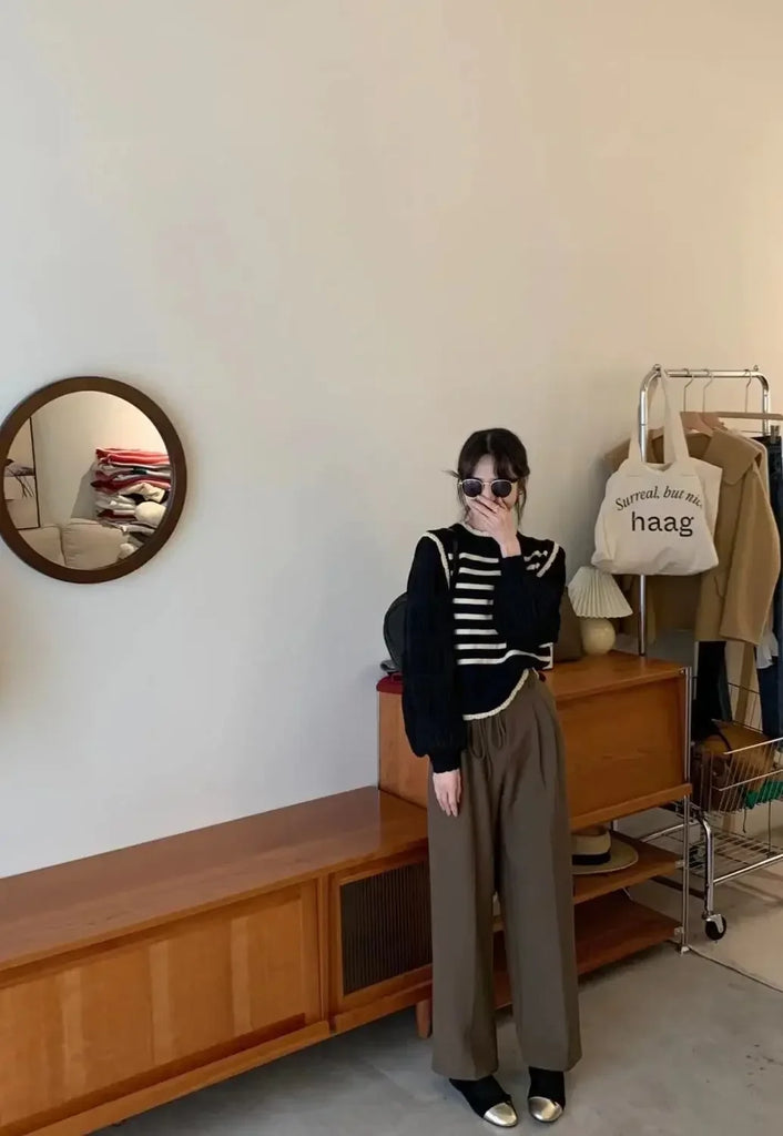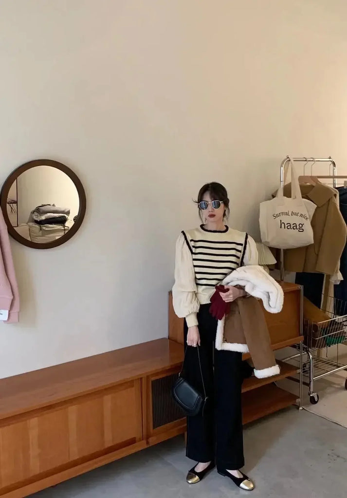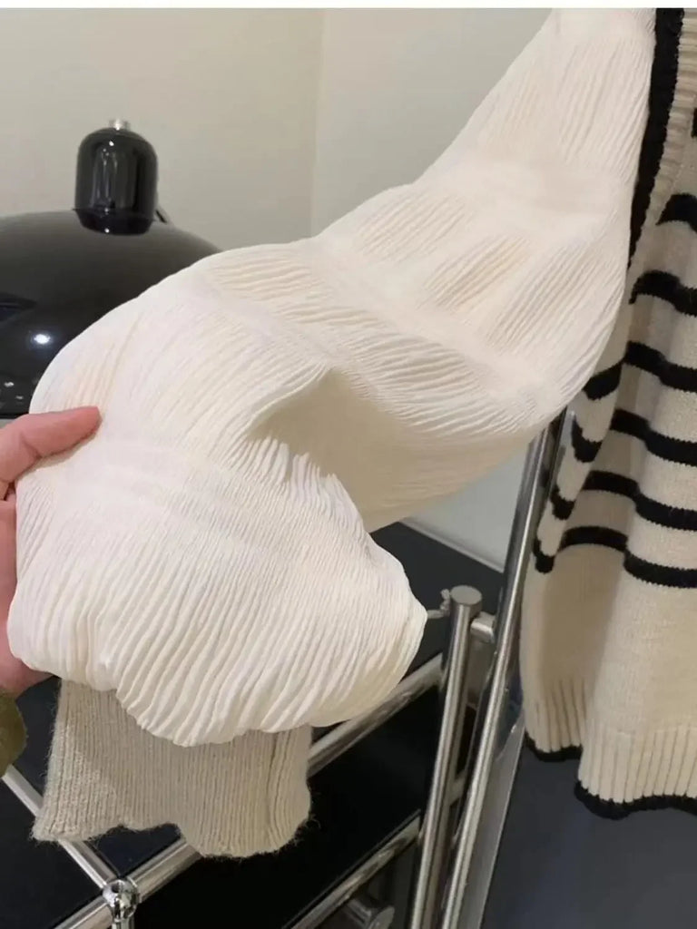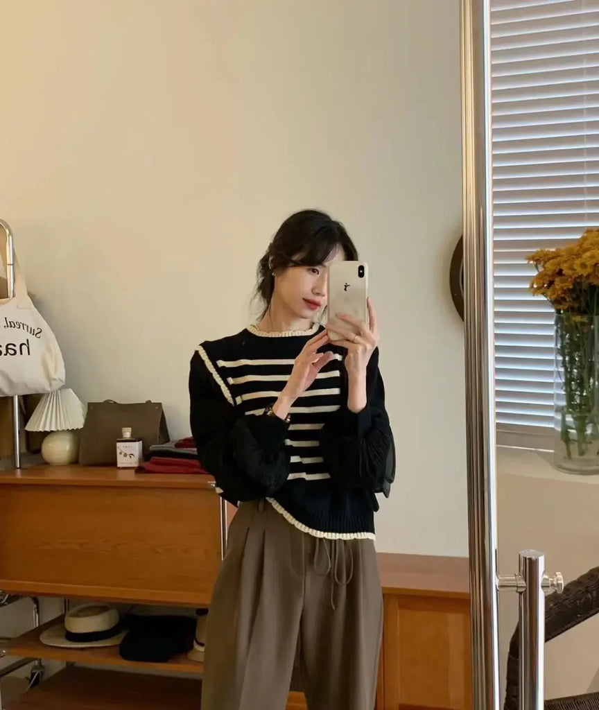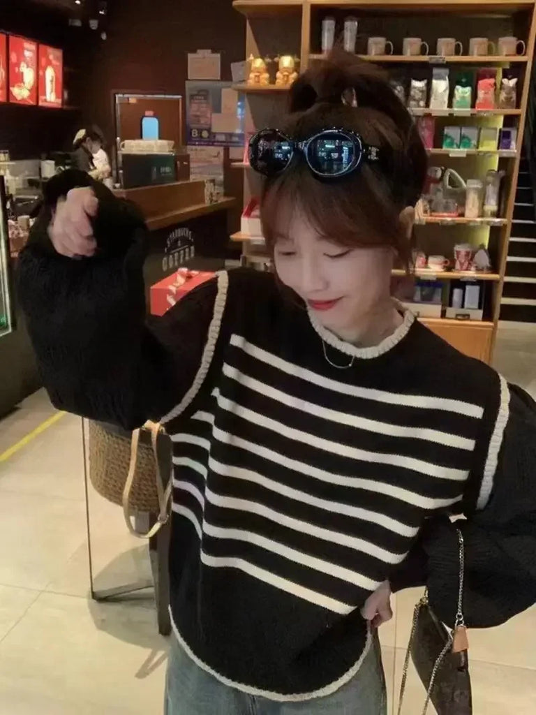 women Black and white striped fake two-piece knitted sweaters pring and autumn Korean soft glutinous pullover sweater female