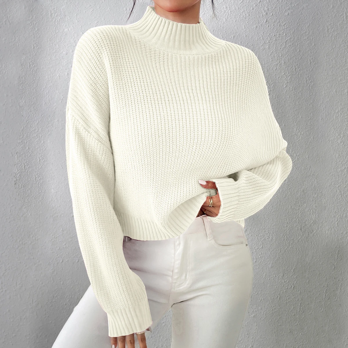 Women's Ribbed Knitted Sweater, Mock Neck Long Sleeve Pullover, Solid Color High Neck Drop Shoulder Jumper