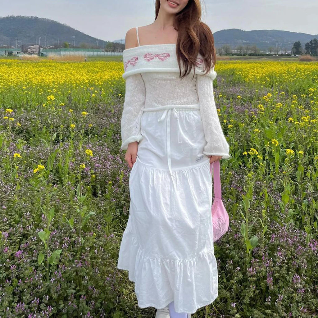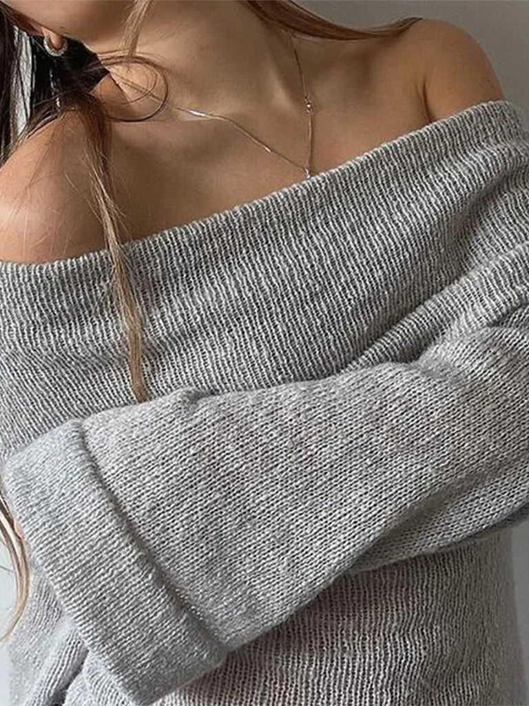 Women's Y2K Cute Off Shoulder Sweaters Chest Folding Slash Neck Flare Long Sleeve Slim Fit Knitted See-through Tops