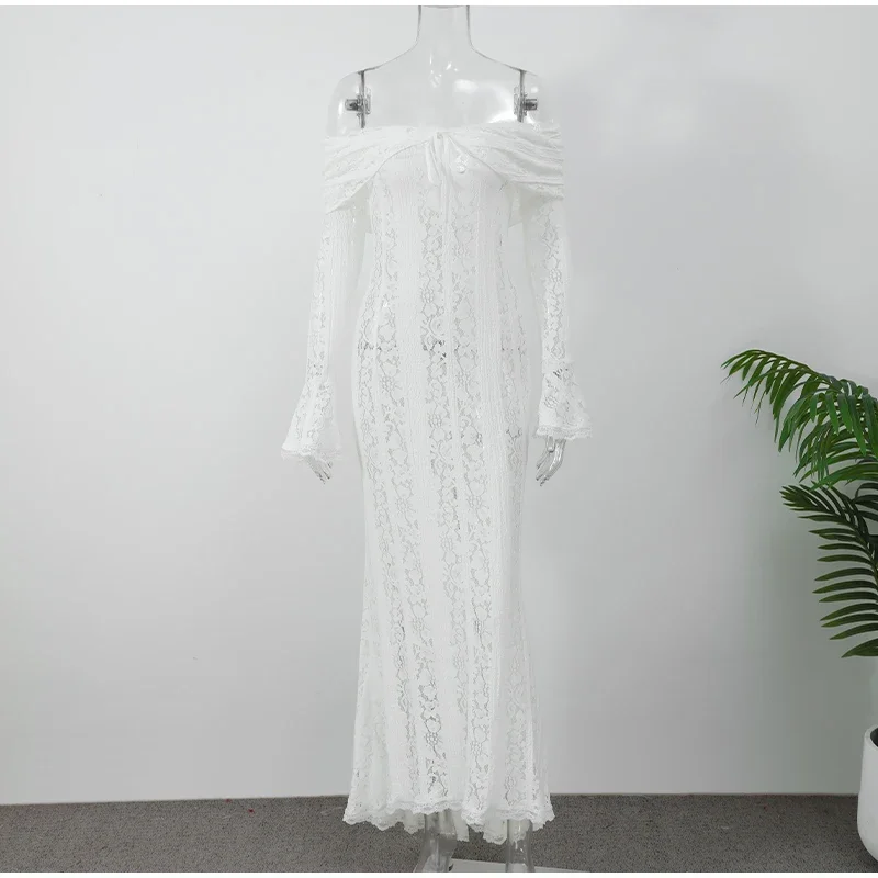 Elegant Lady One-shoulder Slim Lace Up Lace Hollow Out Long Dress For Women Solid Waistless Dresses Chic Party Date Robe
