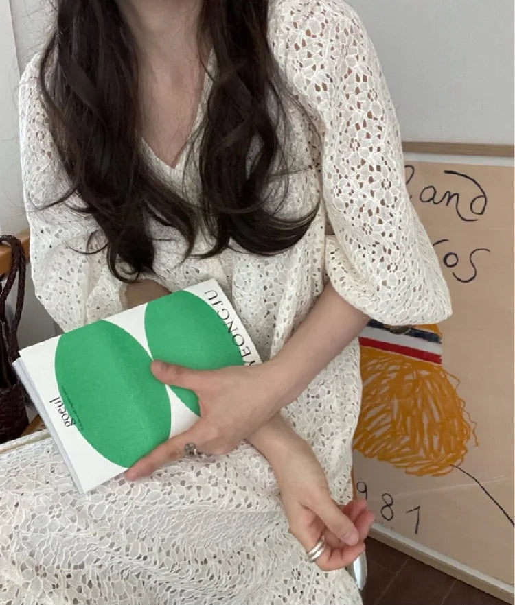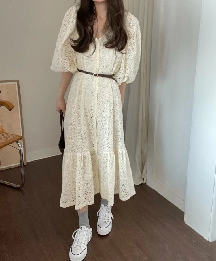 Hook Embroidery Puff Sleeve Spring Long Dress Korea Chic Lace V-neck Button 2025 New Dress A-line Hollow Beige Female Clothing