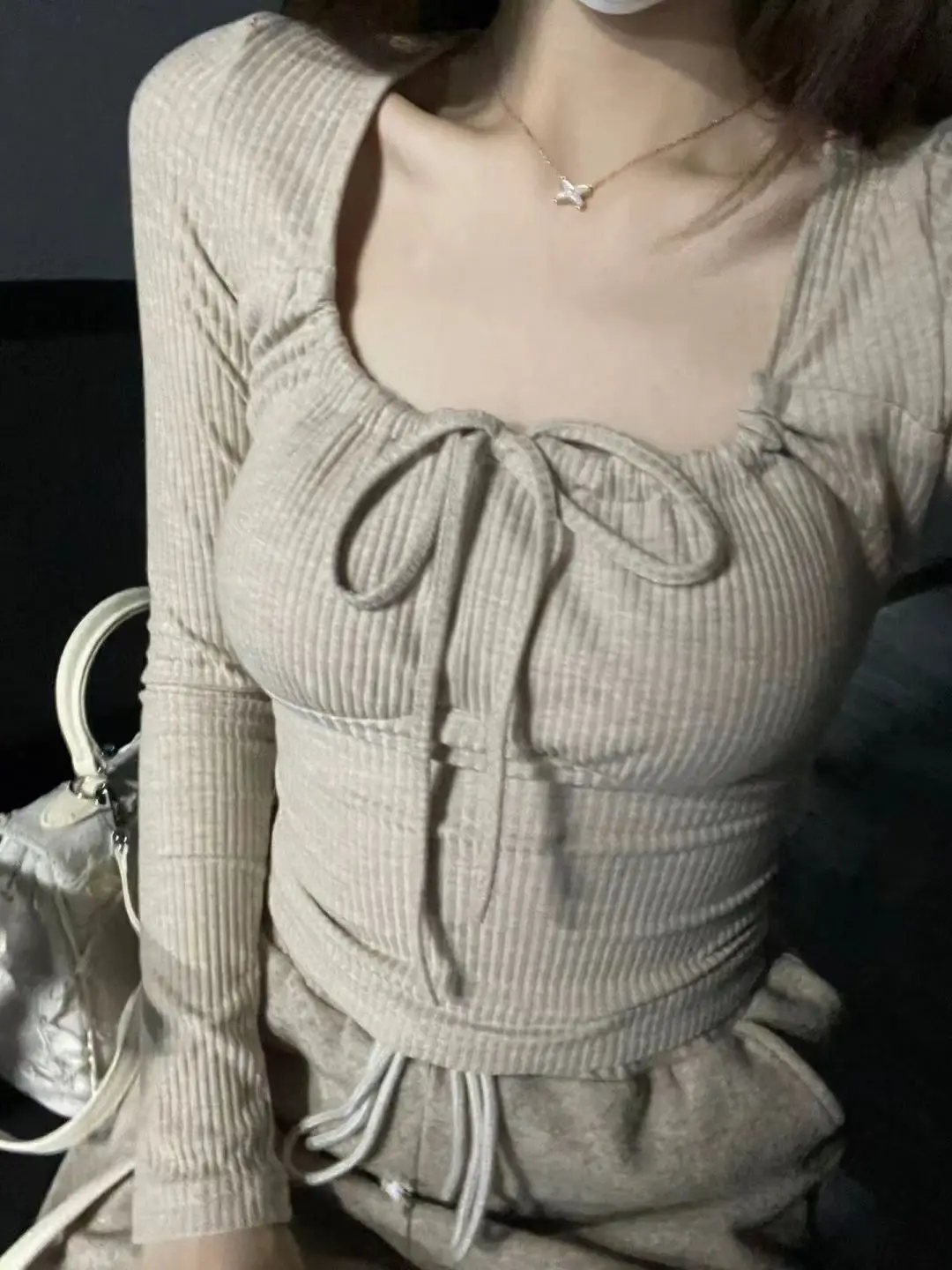 Sexy Khaki T-shirts Women Y2K Aesthetic Vintage Bandage Long Sleeve Tees Korean Fashion Chic Slim Corset Tops