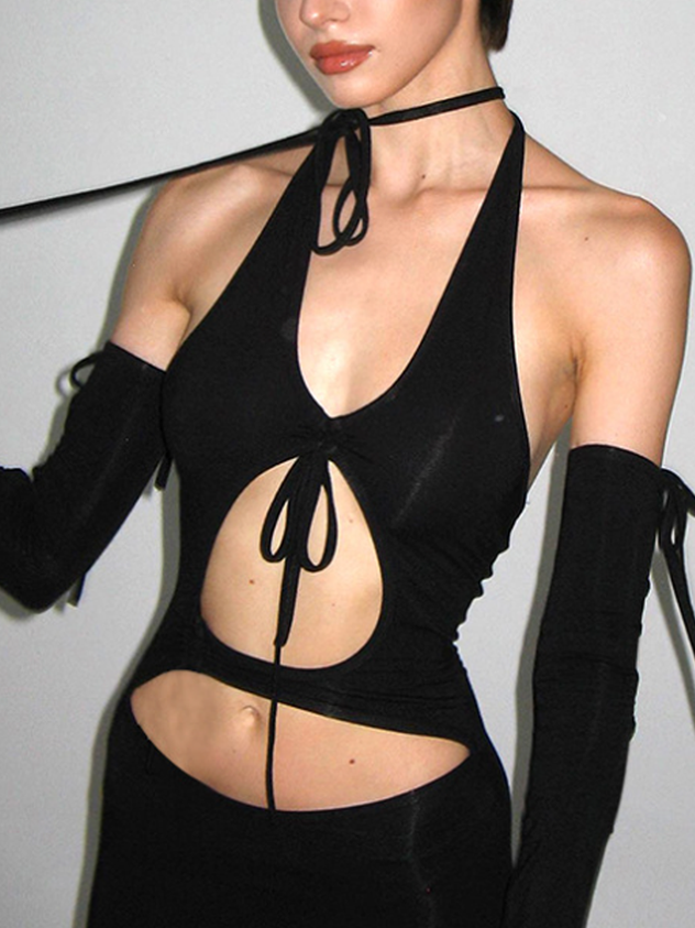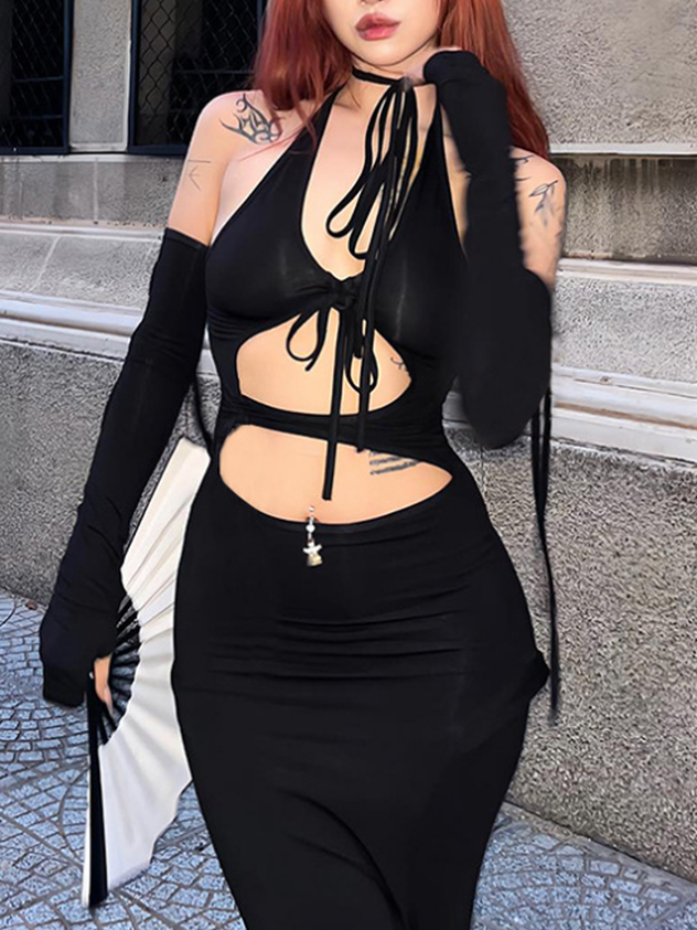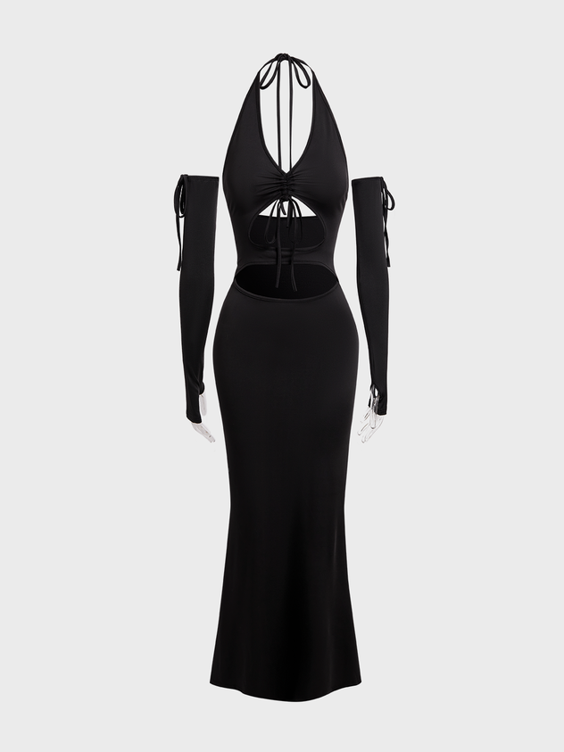 Cut Out Lace Up Halter Plain Long Sleeve Maxi Dress
