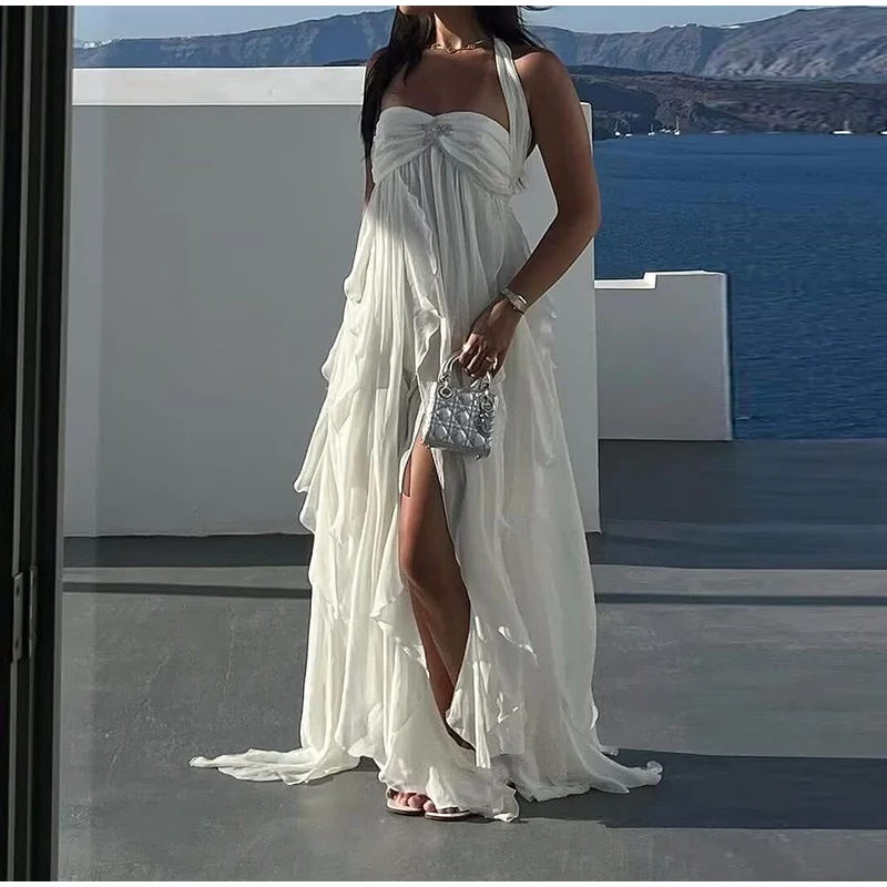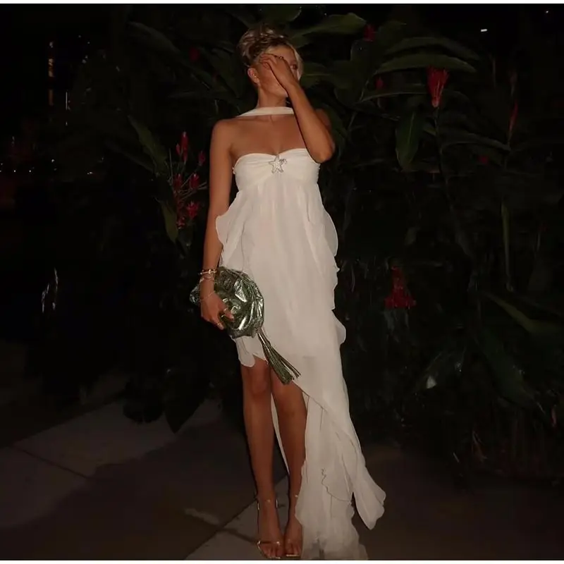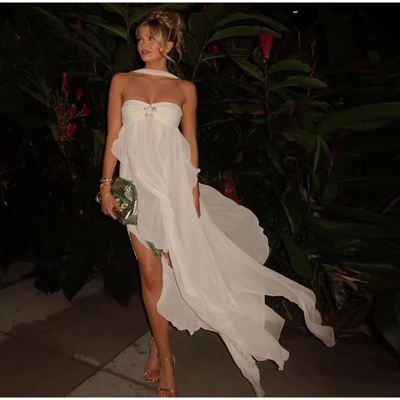 Elegant Irregular Tube Long Dresses Women Retro White Pleated Backless Halter Maxi Evening Dress Female Summer Chic Party Beach