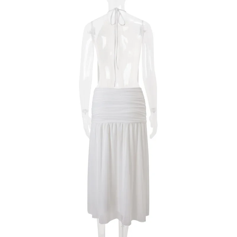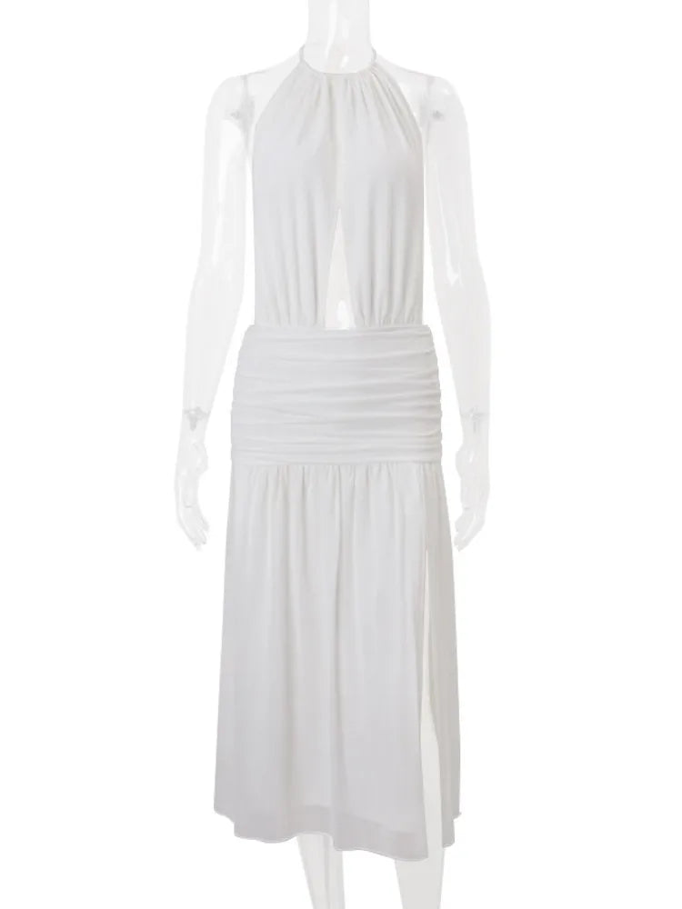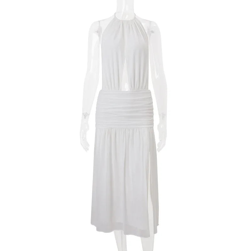 Hollow Out Backless Sexy Maxi Dress Women Gown Summer Off-shoulder Sleeveless Thigh High Split Pleated Long Dress