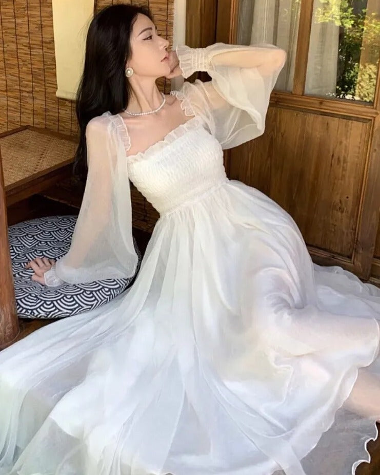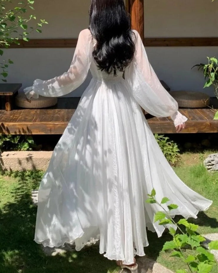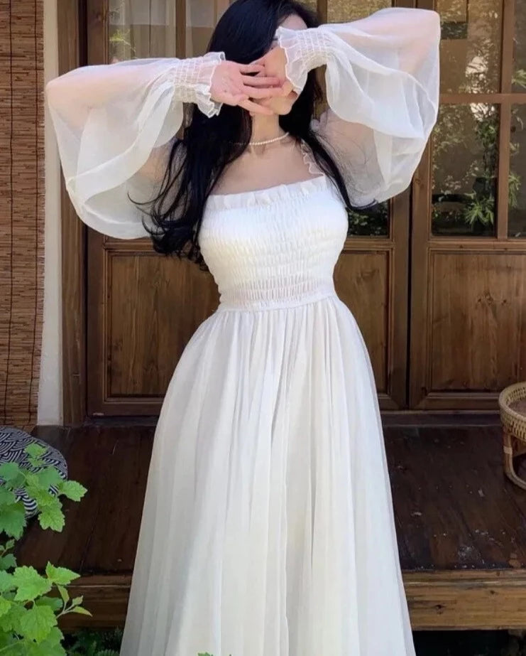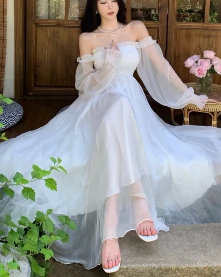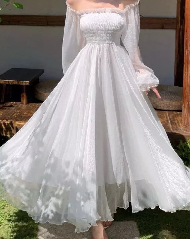 Elegant Maxi Dresses For Women White Off Shoulder Puff Long Sleeve Elastic High Waist Party Gown Ruffle Holiday Dress