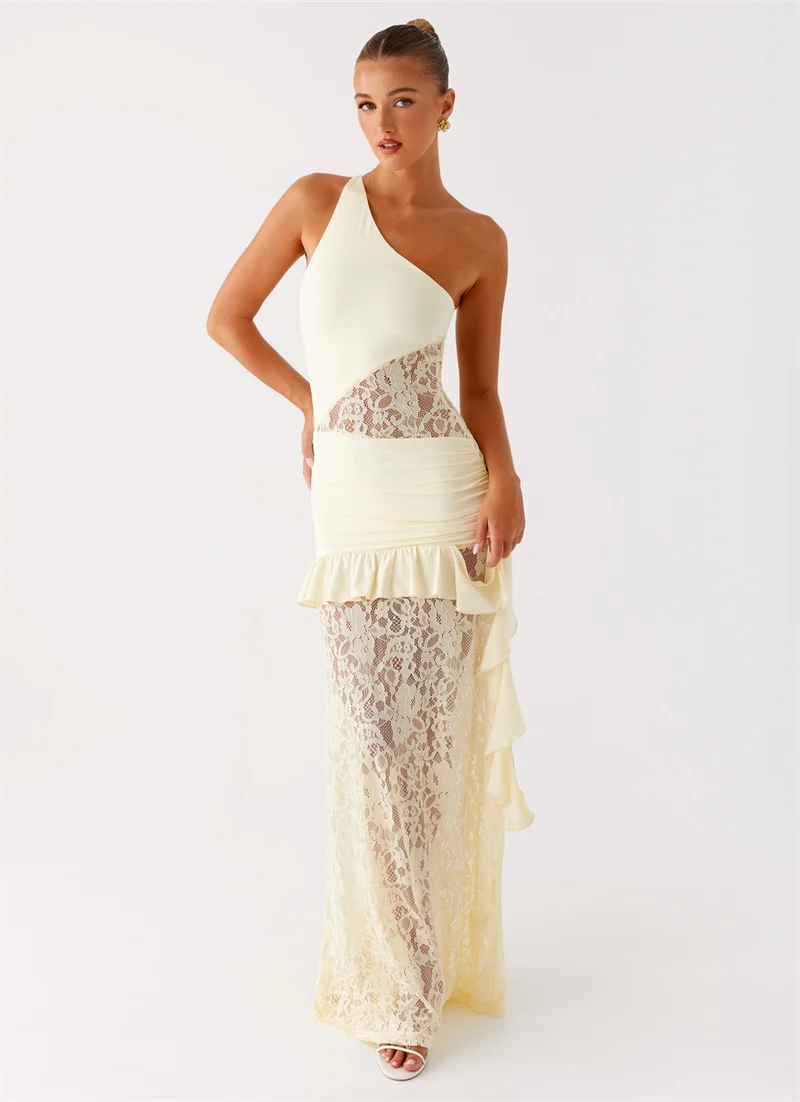 One Shoulder Backless Sexy Maxi Dress Women Lace Patchwork Fashion Sleeveless Lace-up Draped Ruffle Club Long Dress