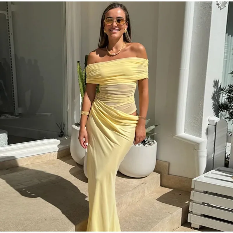 Sexy Off Shoulder Short Sleeve Slim Maxi Dress Elegant Solid Pleated See Through Robes Fashion New Women Evening Vestdios